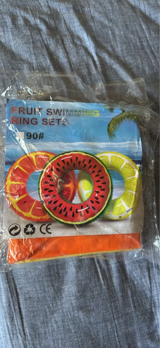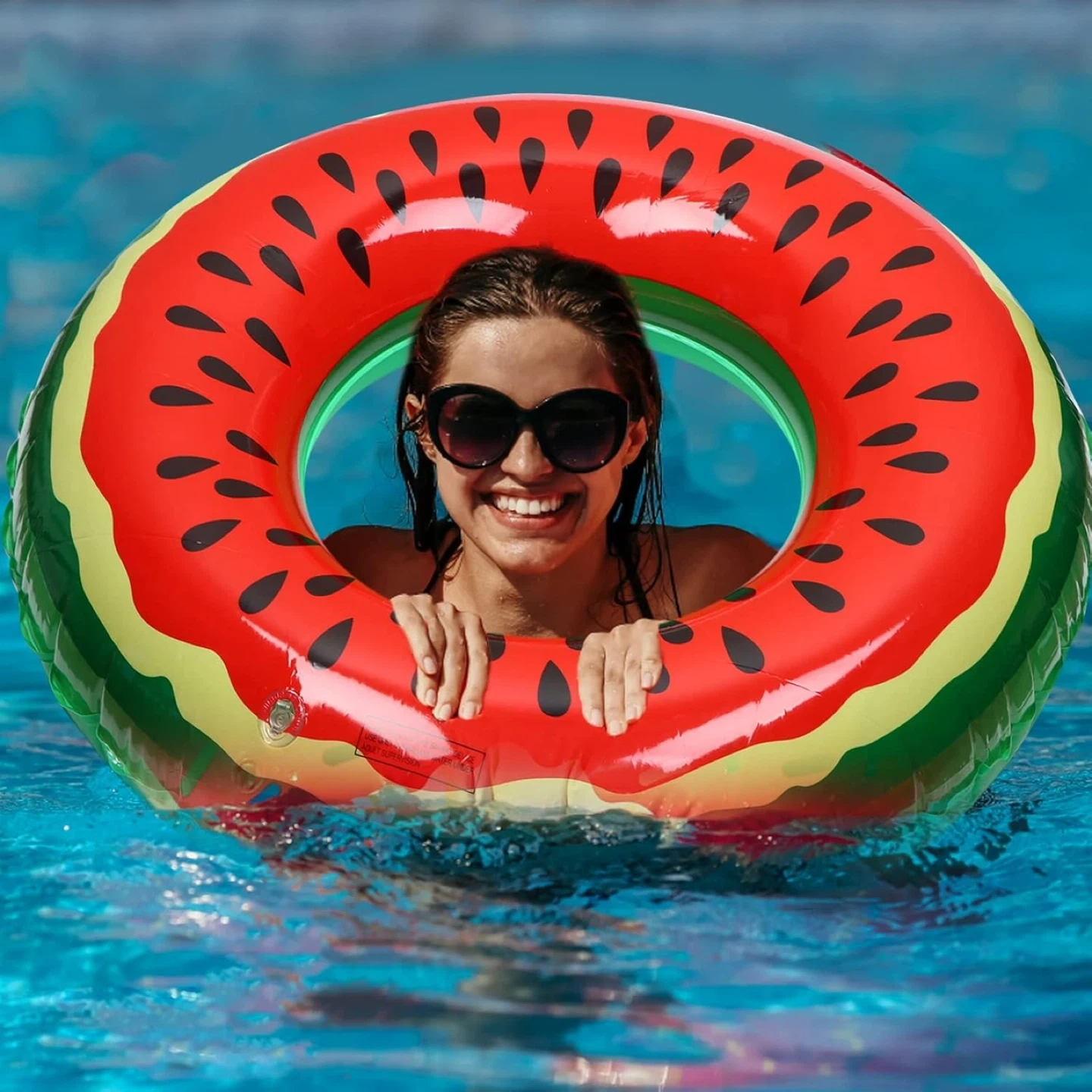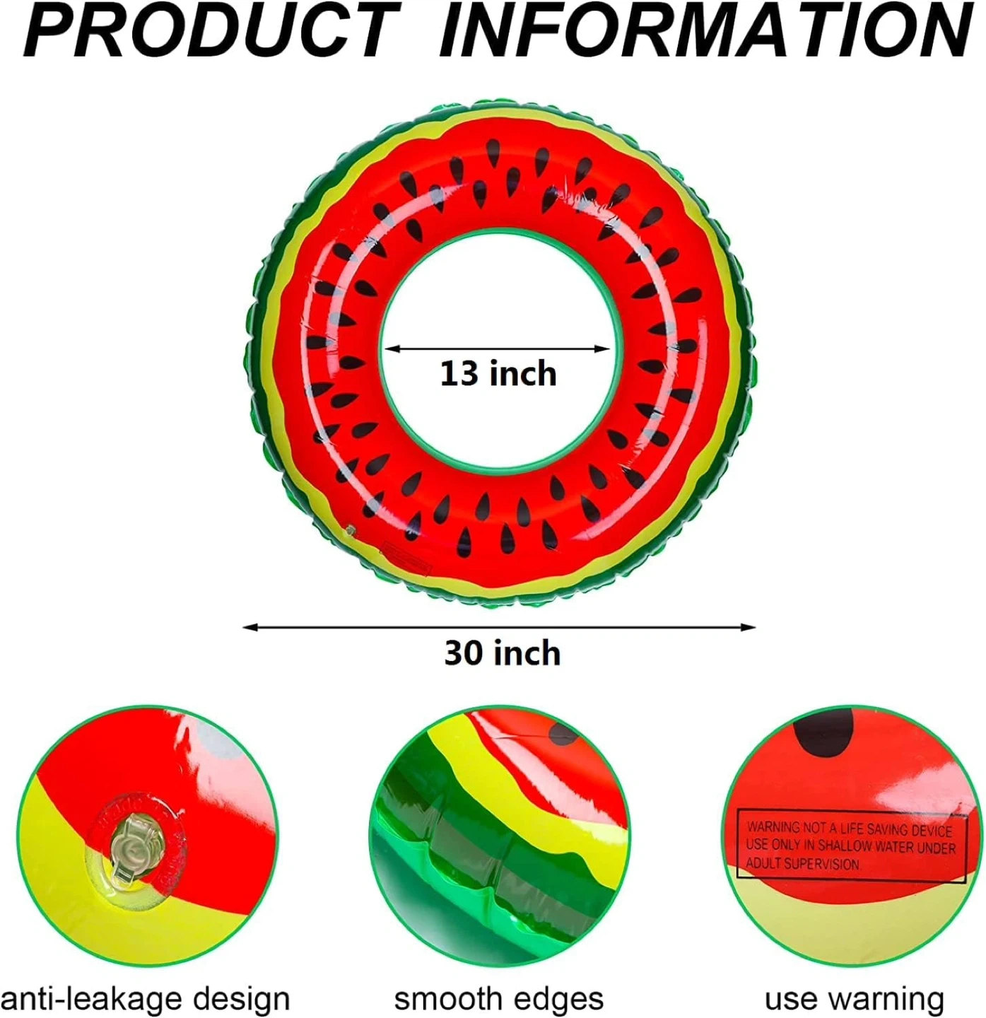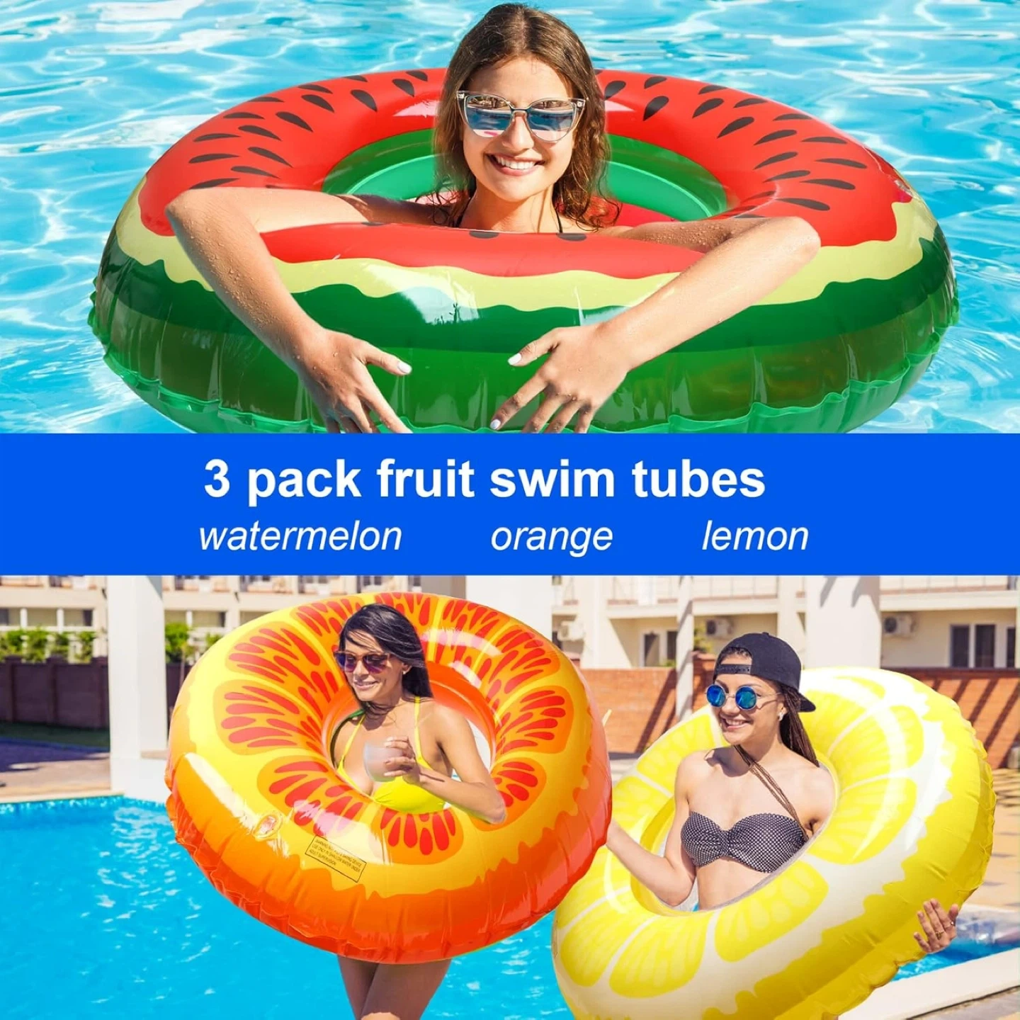This set includes three inflatable swim tubes shaped like fruits: watermelon, orange, and lemon. The watermelon tube has a diameter of 30 inches and an inner diameter of 13 inches. They feature an anti-leakage design and smooth edges for safety. These are fun for pool parties!