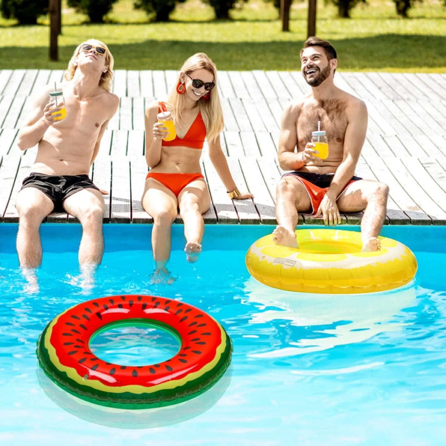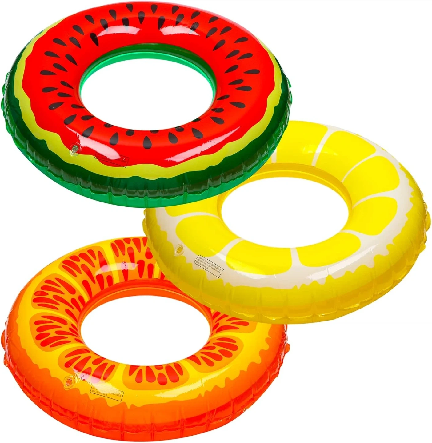 This set includes three inflatable swim tubes shaped like fruits: watermelon, orange, and lemon. The watermelon tube has a diameter of 30 inches and an inner diameter of 13 inches. They feature an anti-leakage design and smooth edges for safety. These are fun for pool parties!