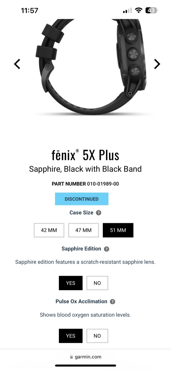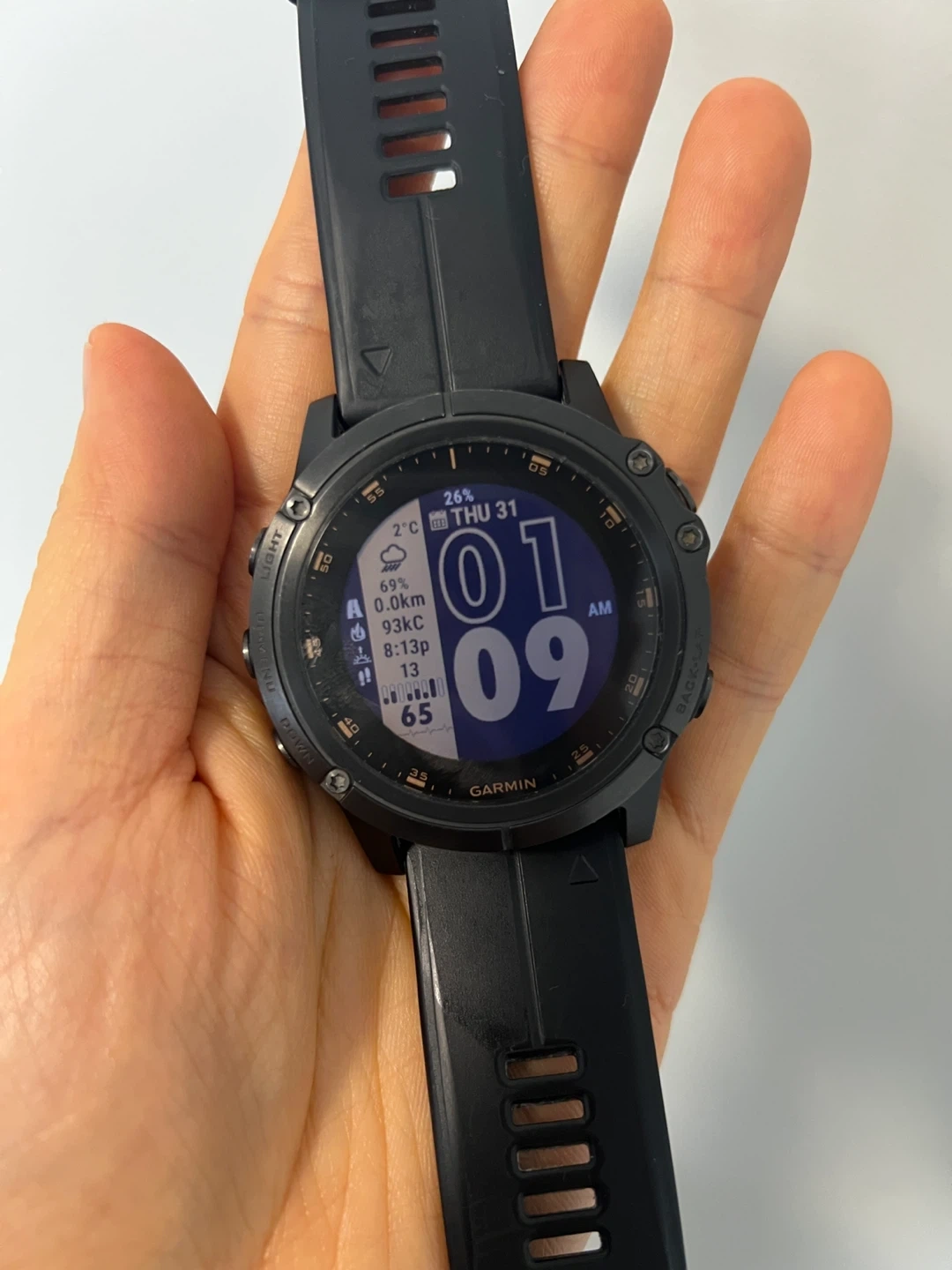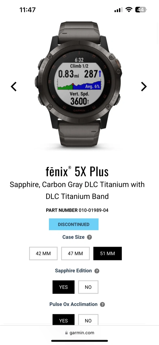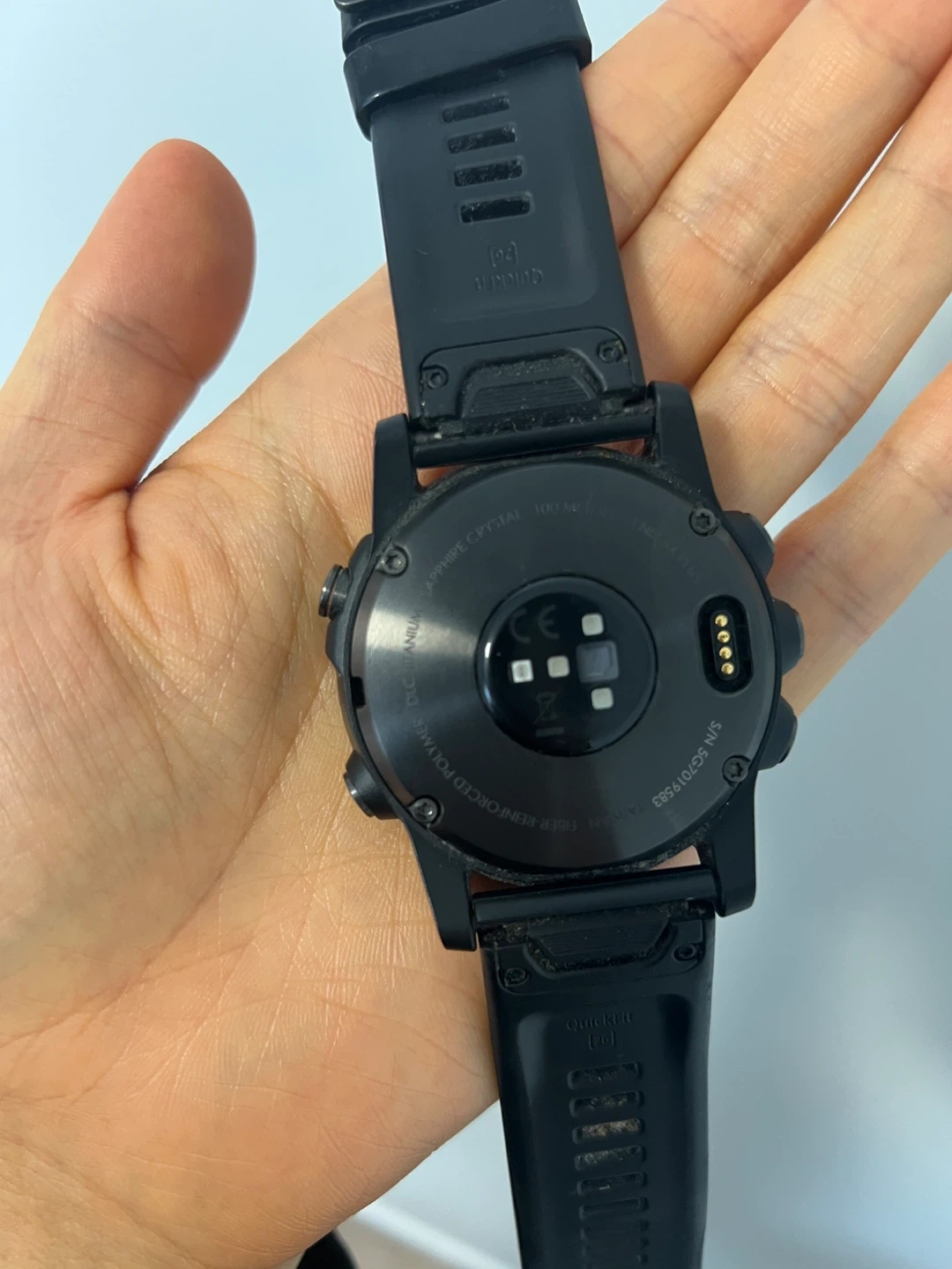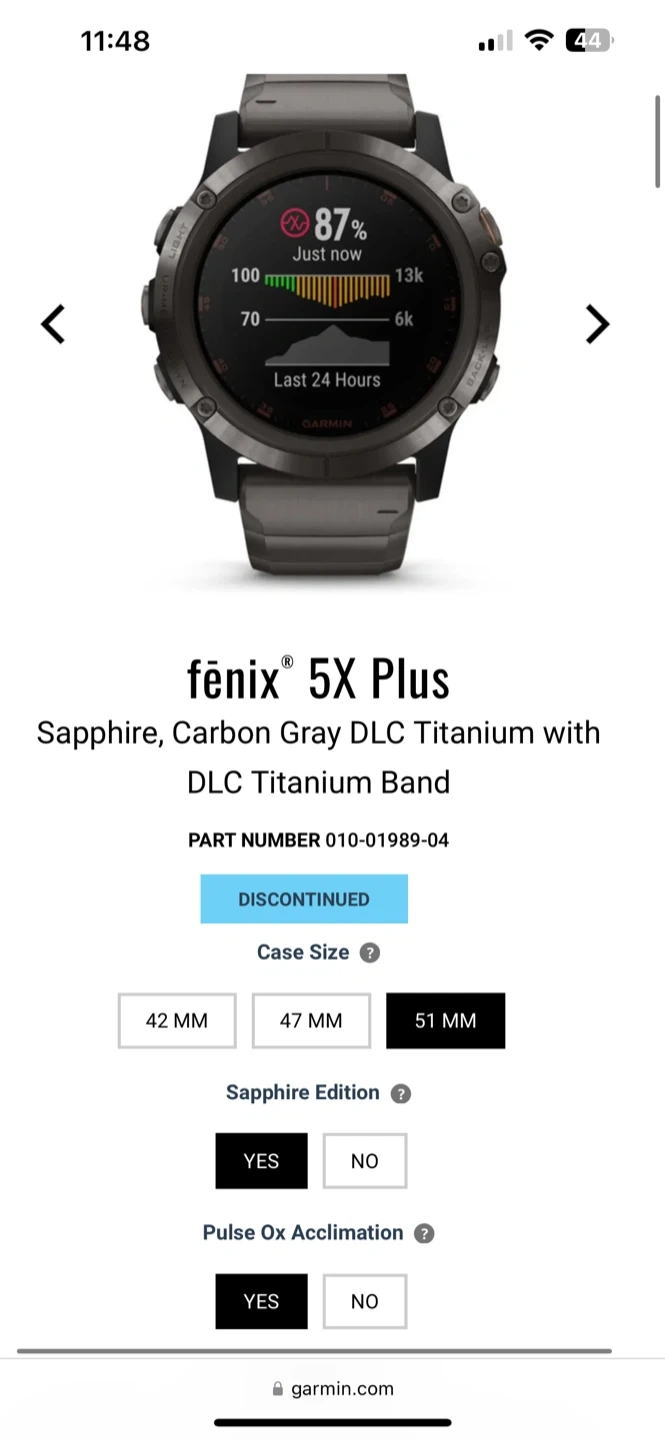 Selling a Garmin Fenix 5X Plus. It's the Sapphire, Carbon Gray DLC Titanium version. The case size is 51mm. Includes: - Watch - Sport Band - Original box