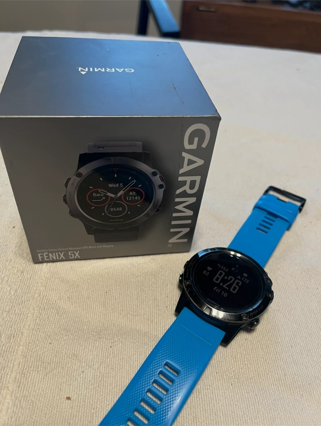 10Selling a Garmin Fenix 5X Sapphire GPS watch! It comes with the original box and also includes additional straps in red and orange. This watch is perfect for tracking your fitness activities and exploring the outdoors