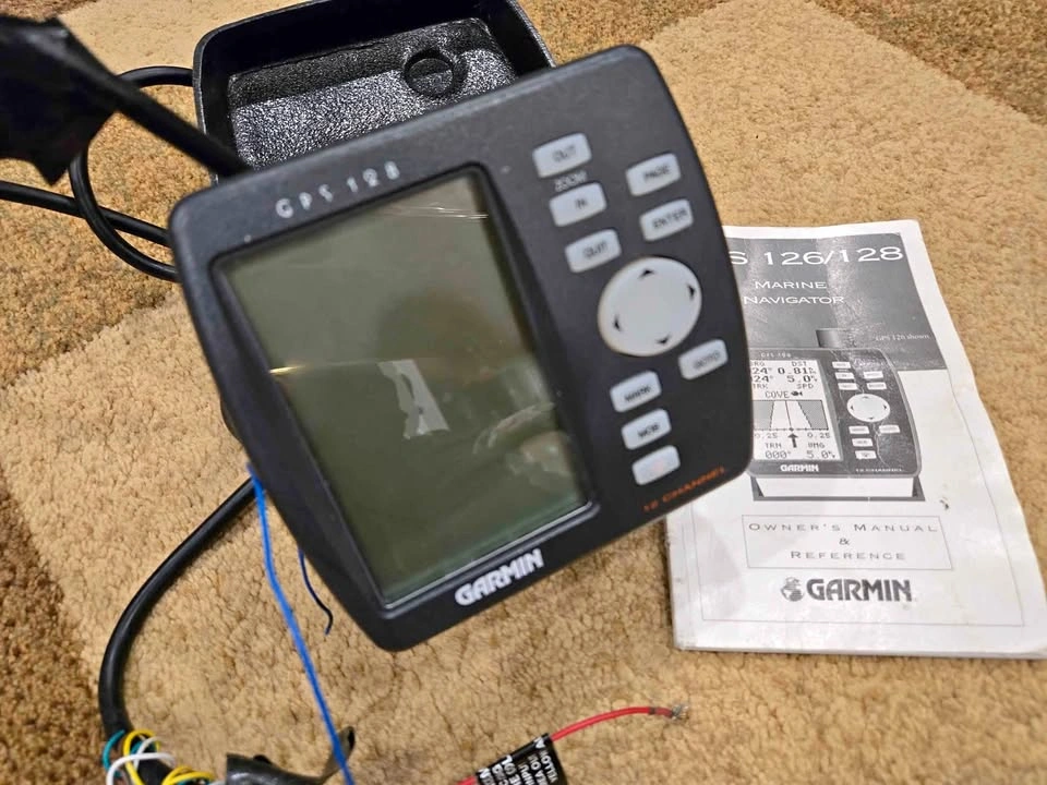 65Garmin Marine GPS 128 Includes mounting bracket, wiring harness, protective cover, and user manual. The unit is fully functional and in good working condition. Please note: the external GPS antenna is not included.