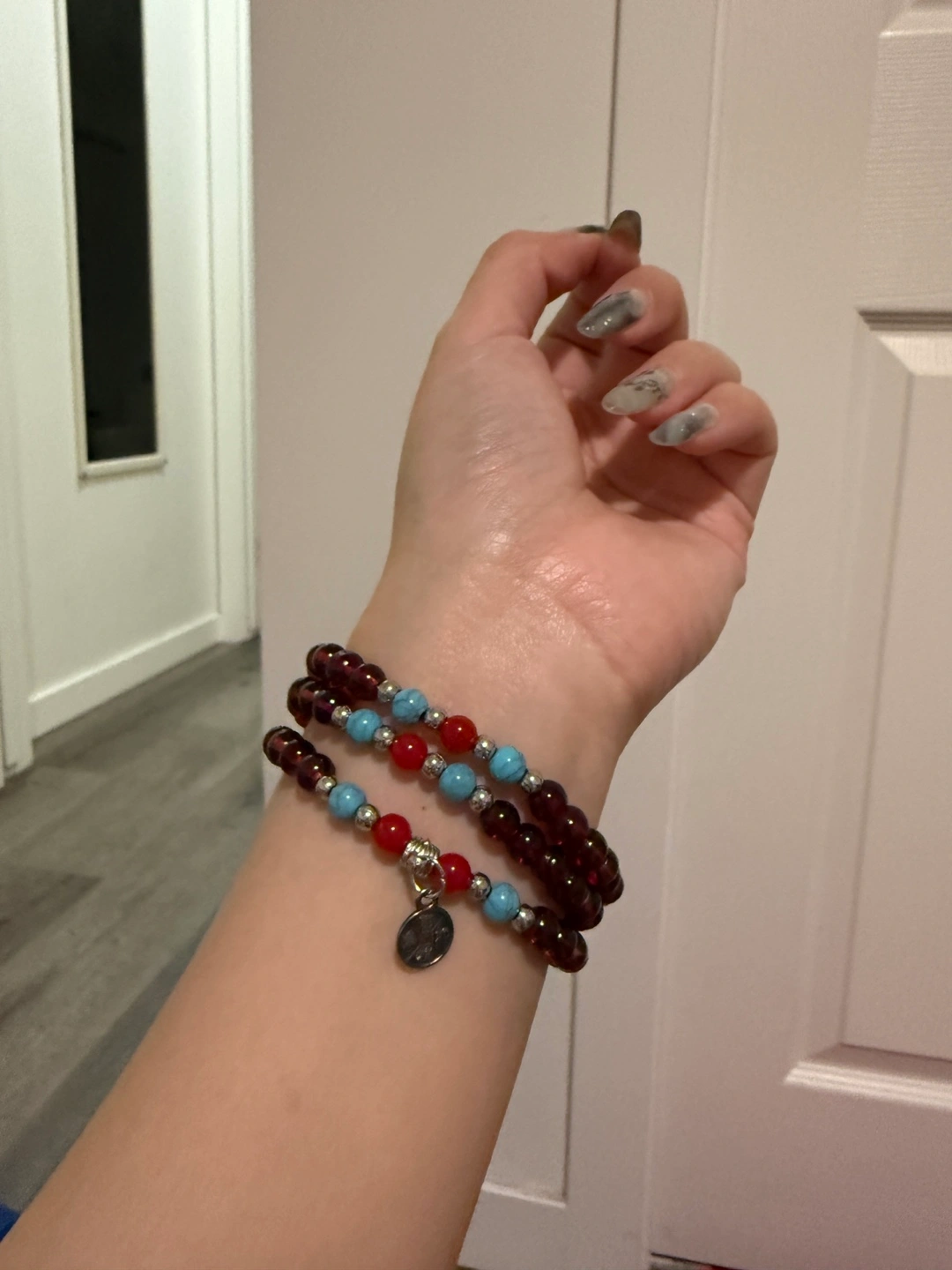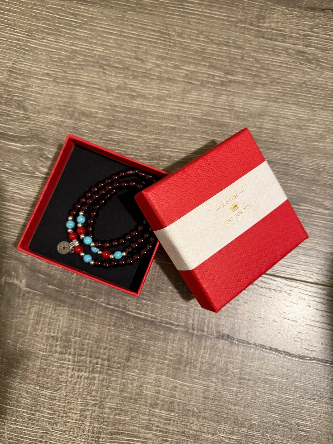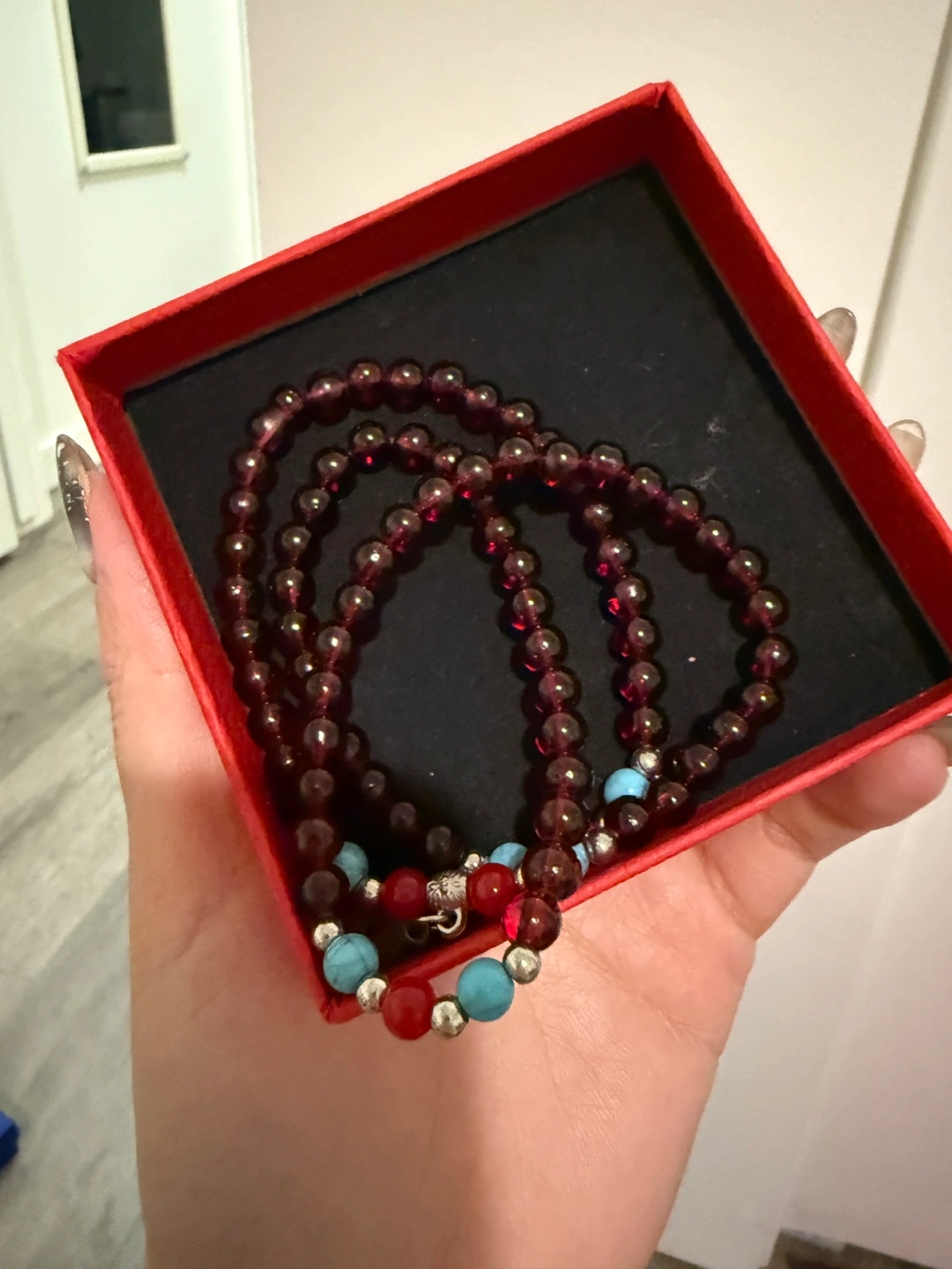 114Beautiful beaded bracelet set. Features garnet and turquoise beads. Comes in a red gift box. Silver charm.