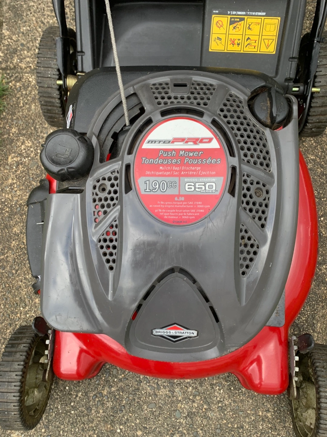 20MTD Pro push lawn mower in excellent condition. Blade sharpened last week. Starts on first pull. Well maintained machine.