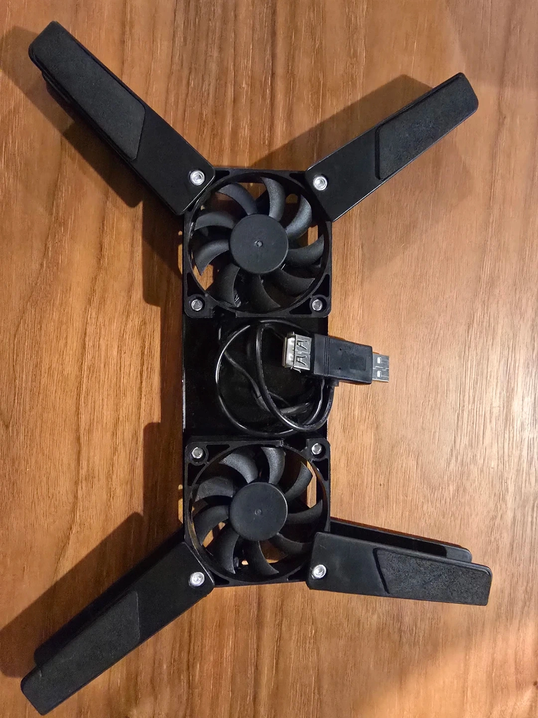 This is a dual-fan USB laptop cooling pad. It features adjustable support arms for stability and a USB cable for power. It's made of black plastic.