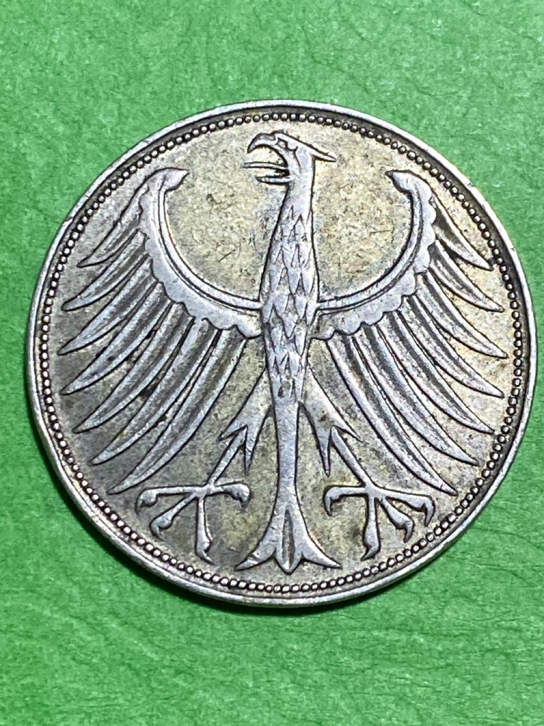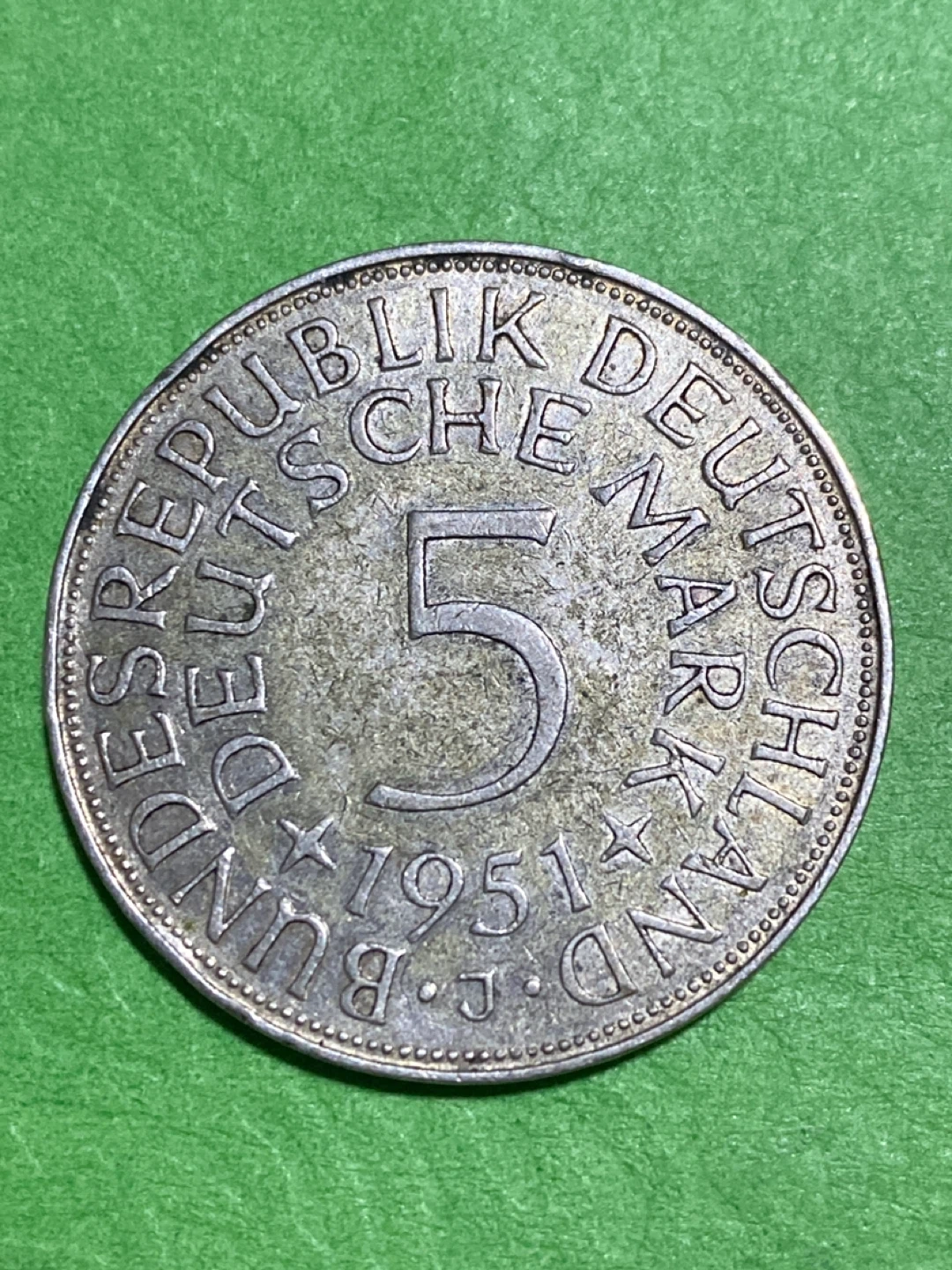 Coin from the Federal Republic of Germany. It's a 5 Deutsche Mark coin minted in 1951. Features an eagle emblem on one side and "BUNDESREPUBLIK DEUTSCHLAND" text on the other.
