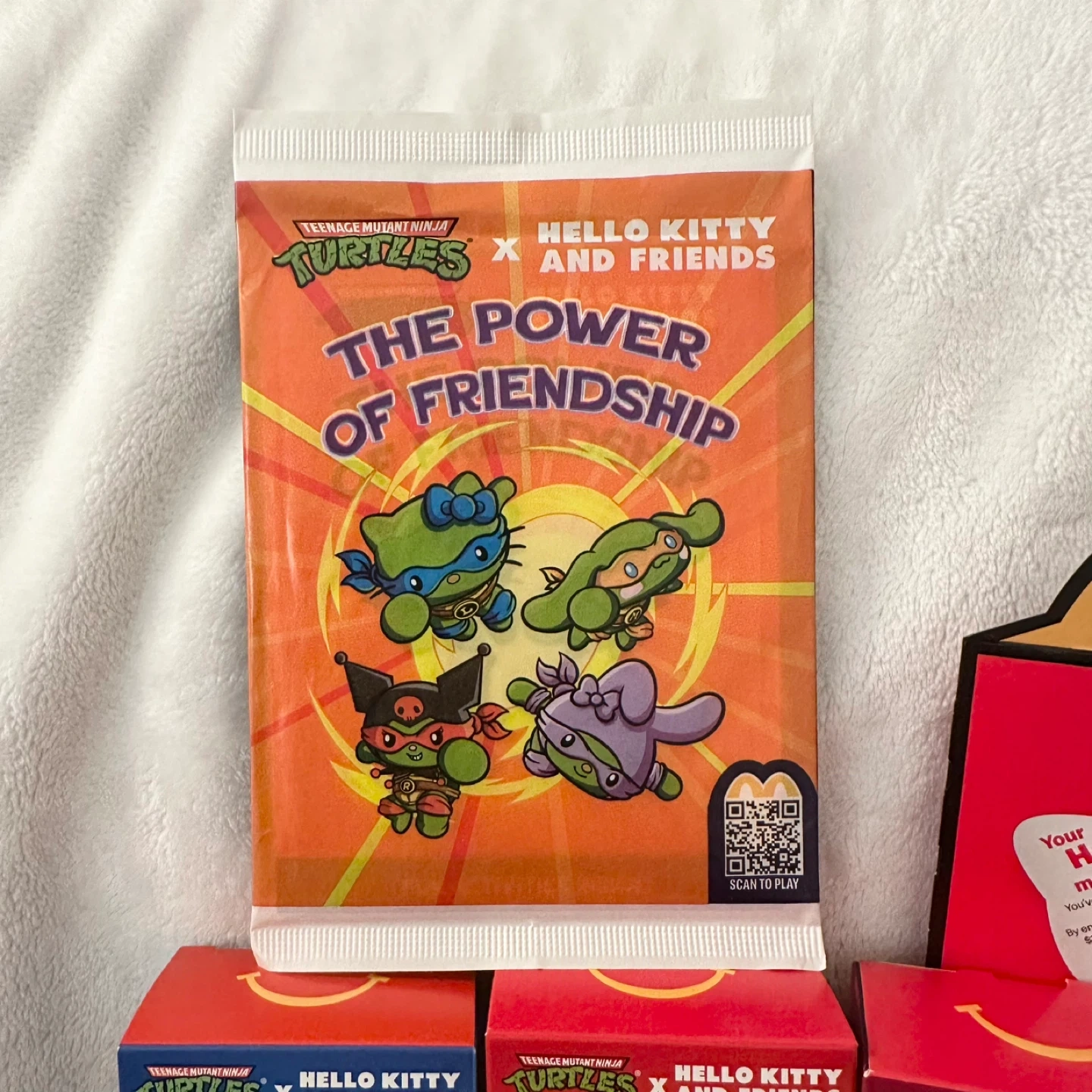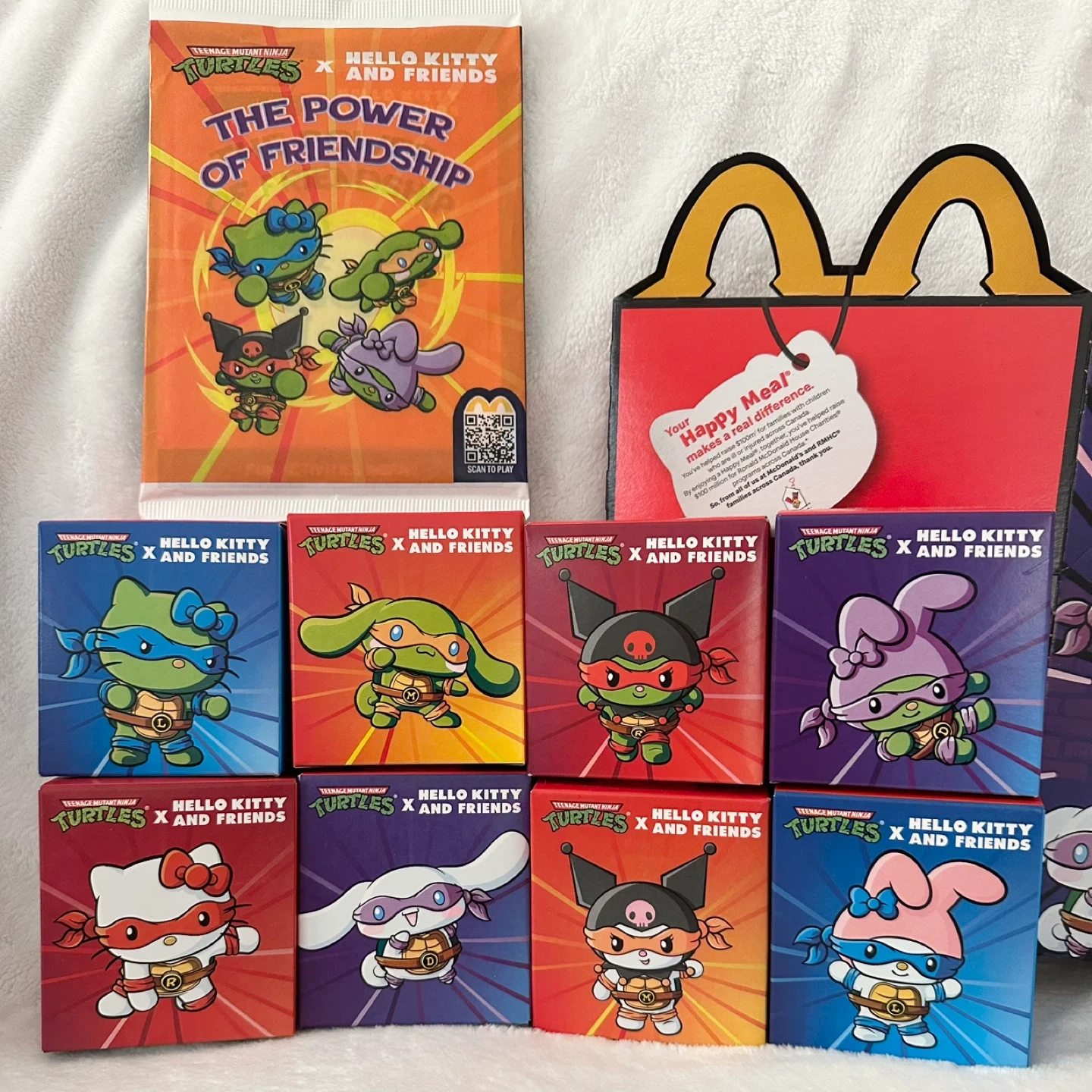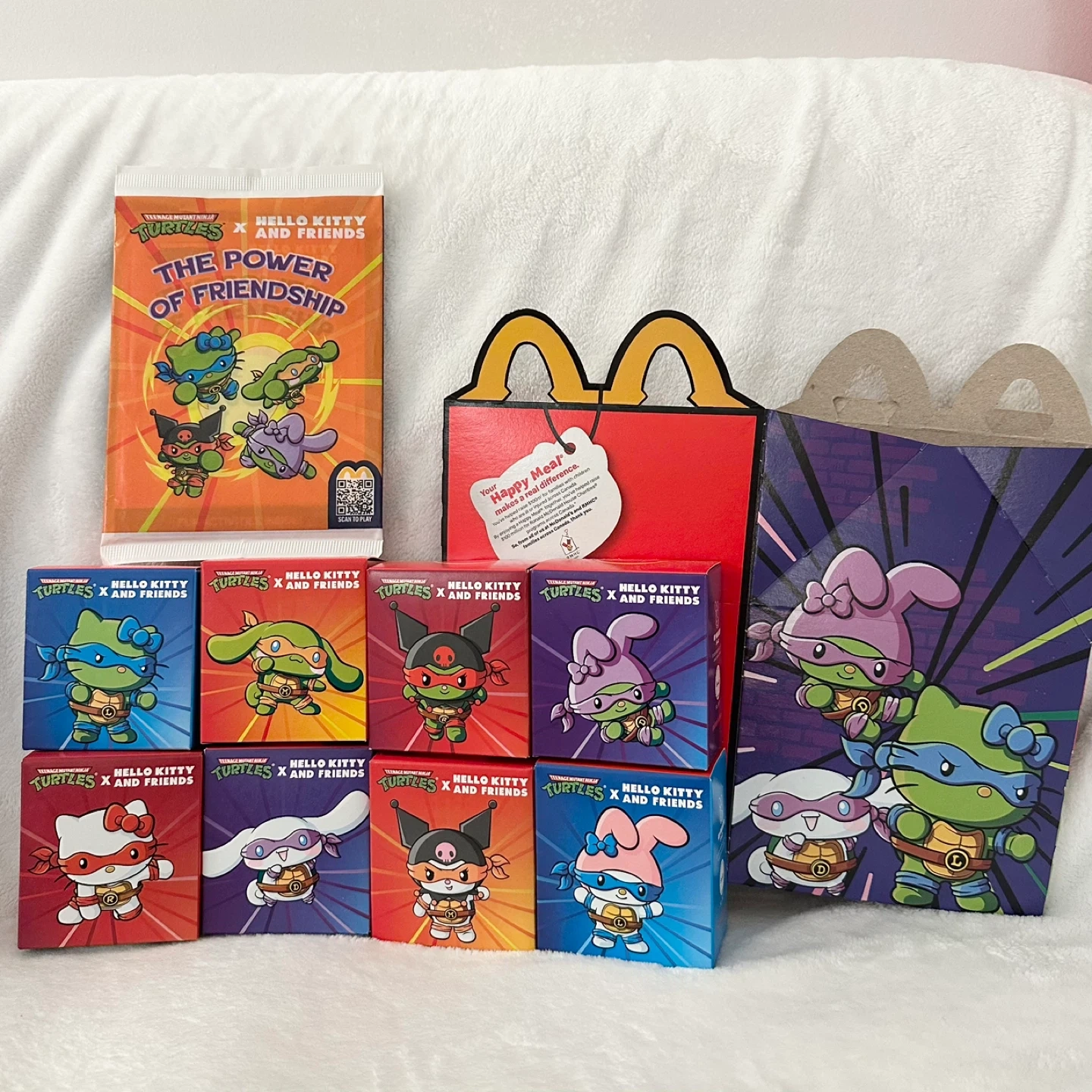 This collection features the full set of Teenage Mutant Ninja Turtles x Hello Kitty and Friends toys from Happy Meals. It includes 8 individually packaged figurines showcasing different characters. Plus the super rare "The Power of Friendship" book and the happy meal box.