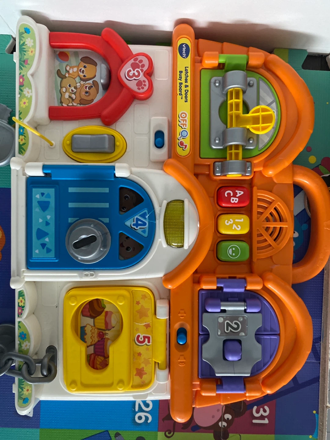 Fun and educational toy for toddlers. Features various latches, doors, and other interactive elements. Great for developing fine motor skills and problem-solving abilities. Great catchy tunes! Portable handle for easy transport.