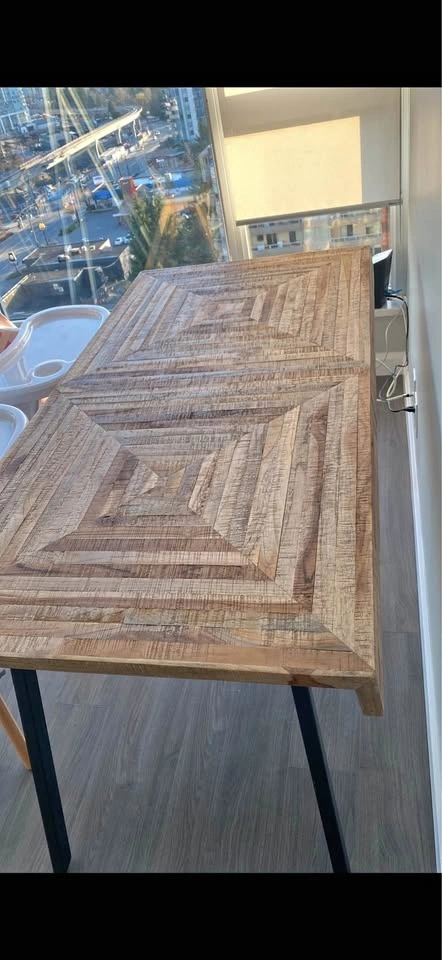 Beautiful dining table with a unique patterned wood top and black metal legs. Great for your dining room or kitchen. Dimensions are 59 inches long, 30 inches wide, and 30 inches high. Chairs sold separately.