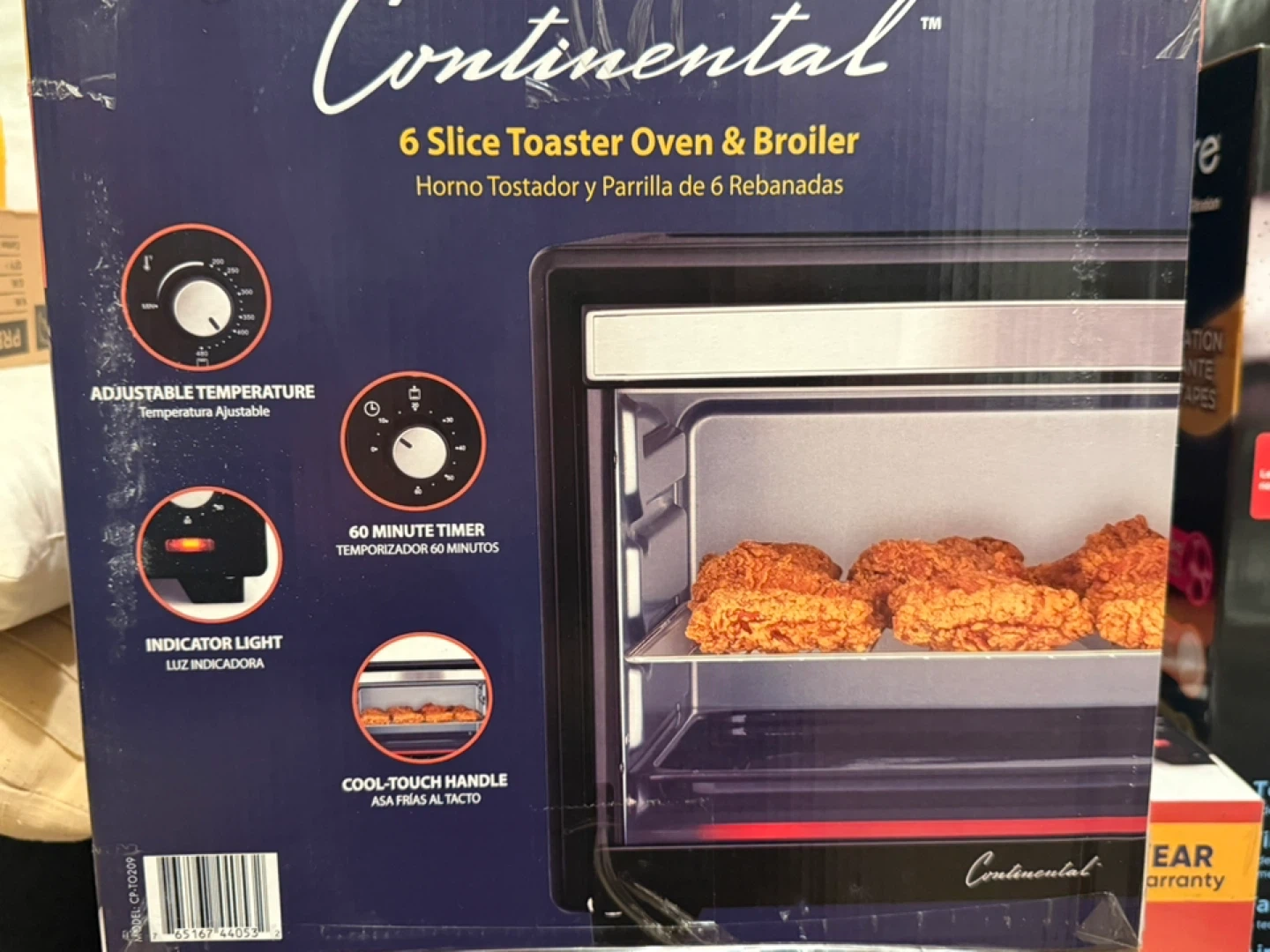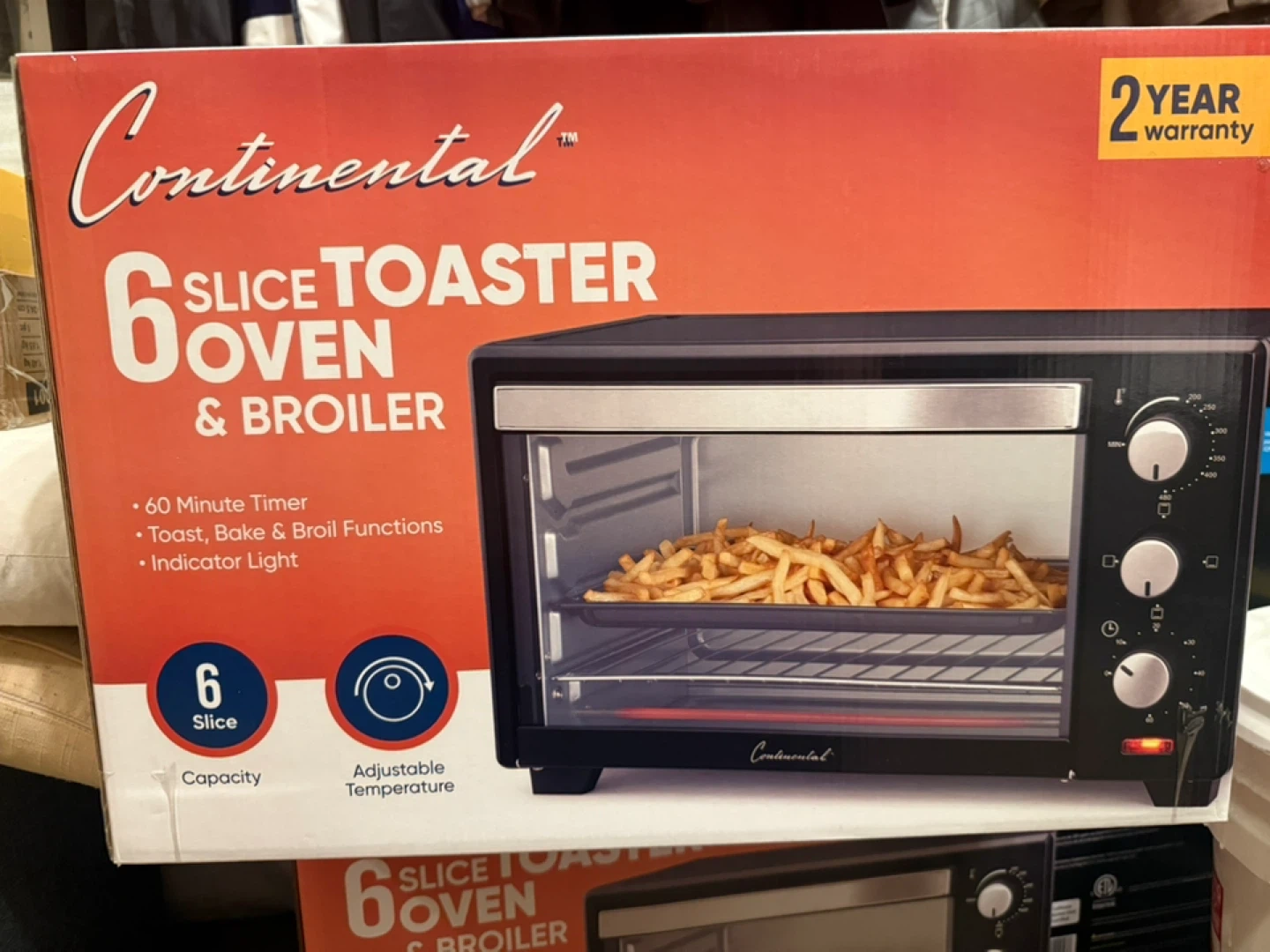 This Continental 6 slice toaster oven and broiler comes with a 60-minute timer and adjustable temperature. It has toast, bake, and broil functions, plus an indicator light. It's a handy appliance for quick meals!