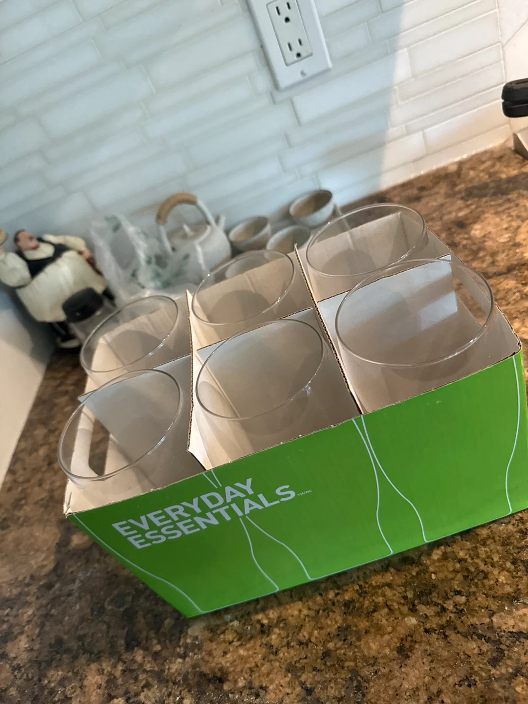This is a set of six drinking glasses from Everyday Essentials. They're made of clear glass and come in their original packaging. These glasses are suitable for everyday use.