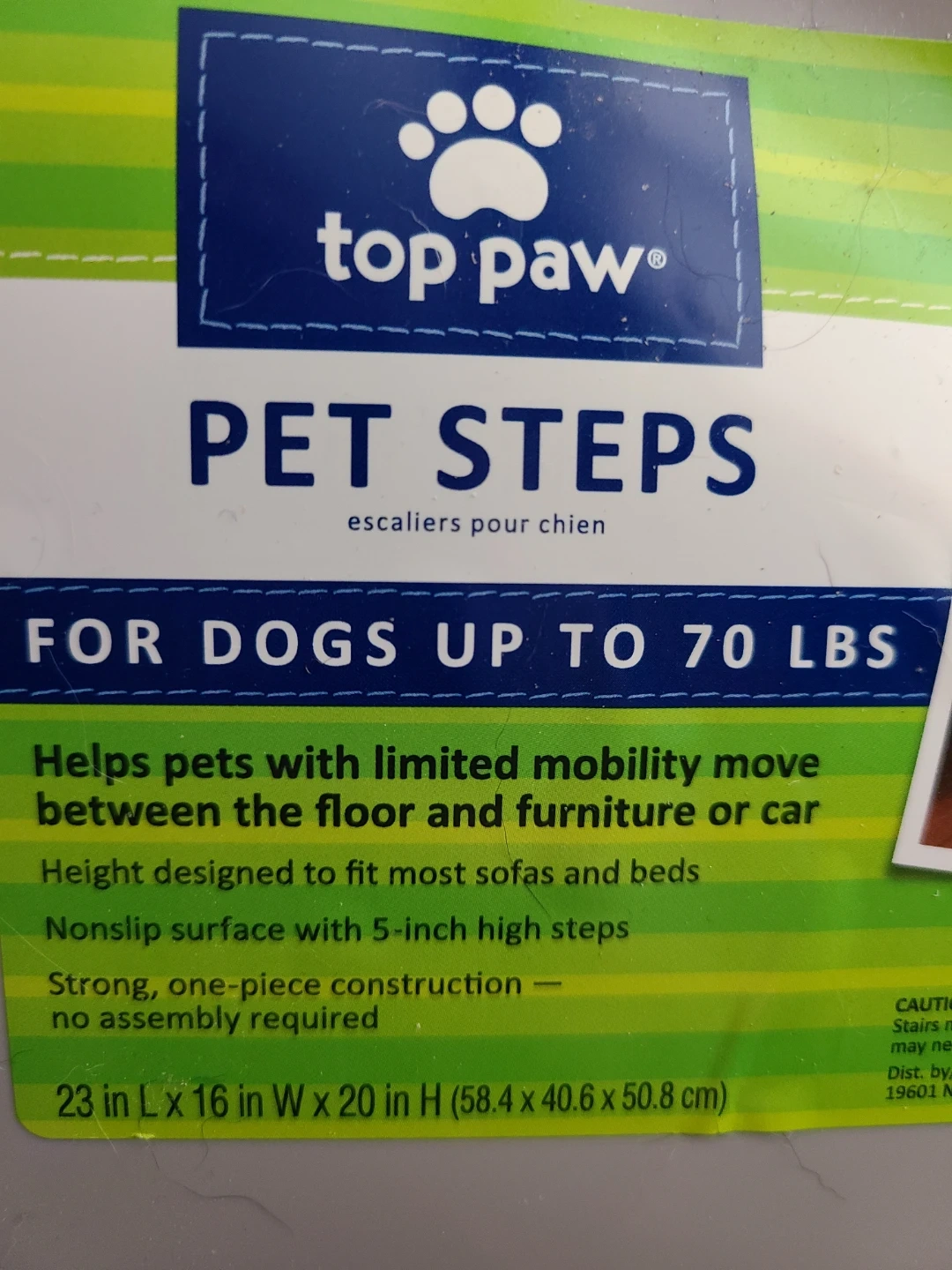 These Top Paw pet steps are designed for dogs up to 70 lbs. They help pets with limited mobility move between floors, sofas, and cars. The nonslip surface has 5-inch high steps and a strong, one-piece construction. Total measurements in picture.