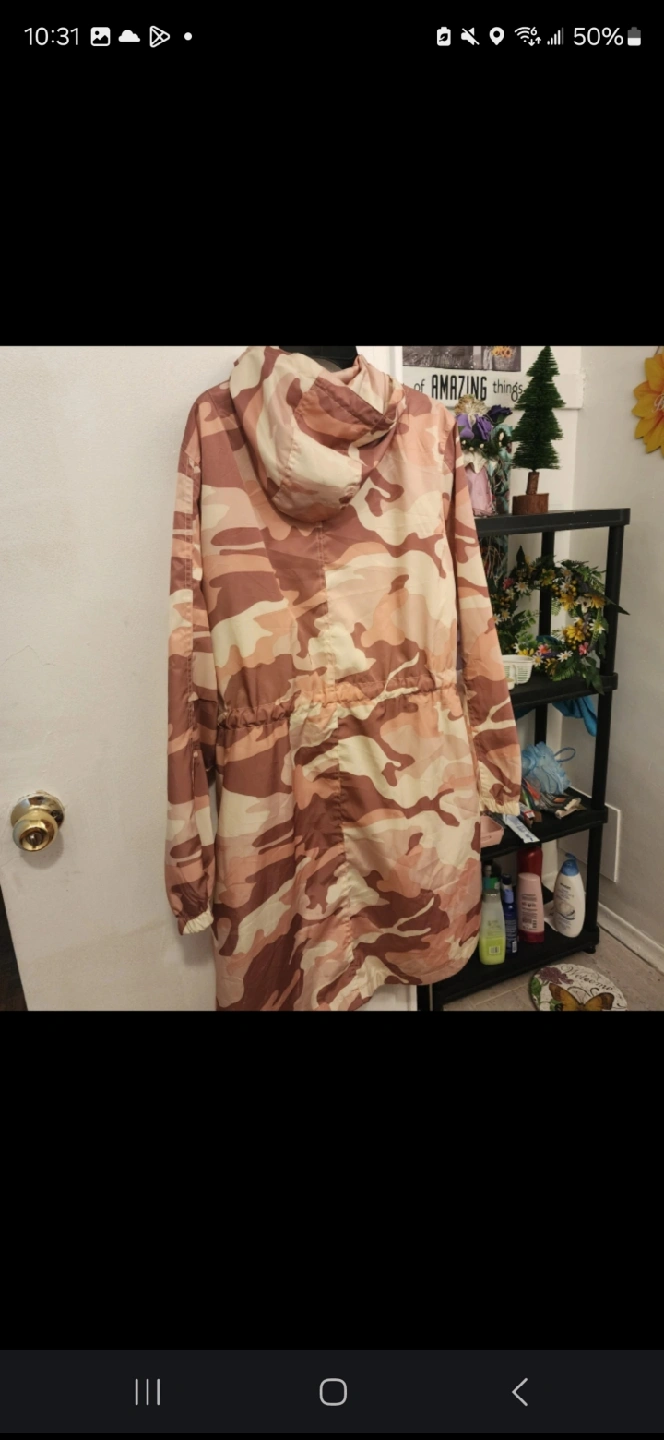 Here's a stylish camouflage print anorak jacket! It features a hood and a drawstring waist for a flattering fit. Perfect for adding a touch of urban flair to your wardrobe