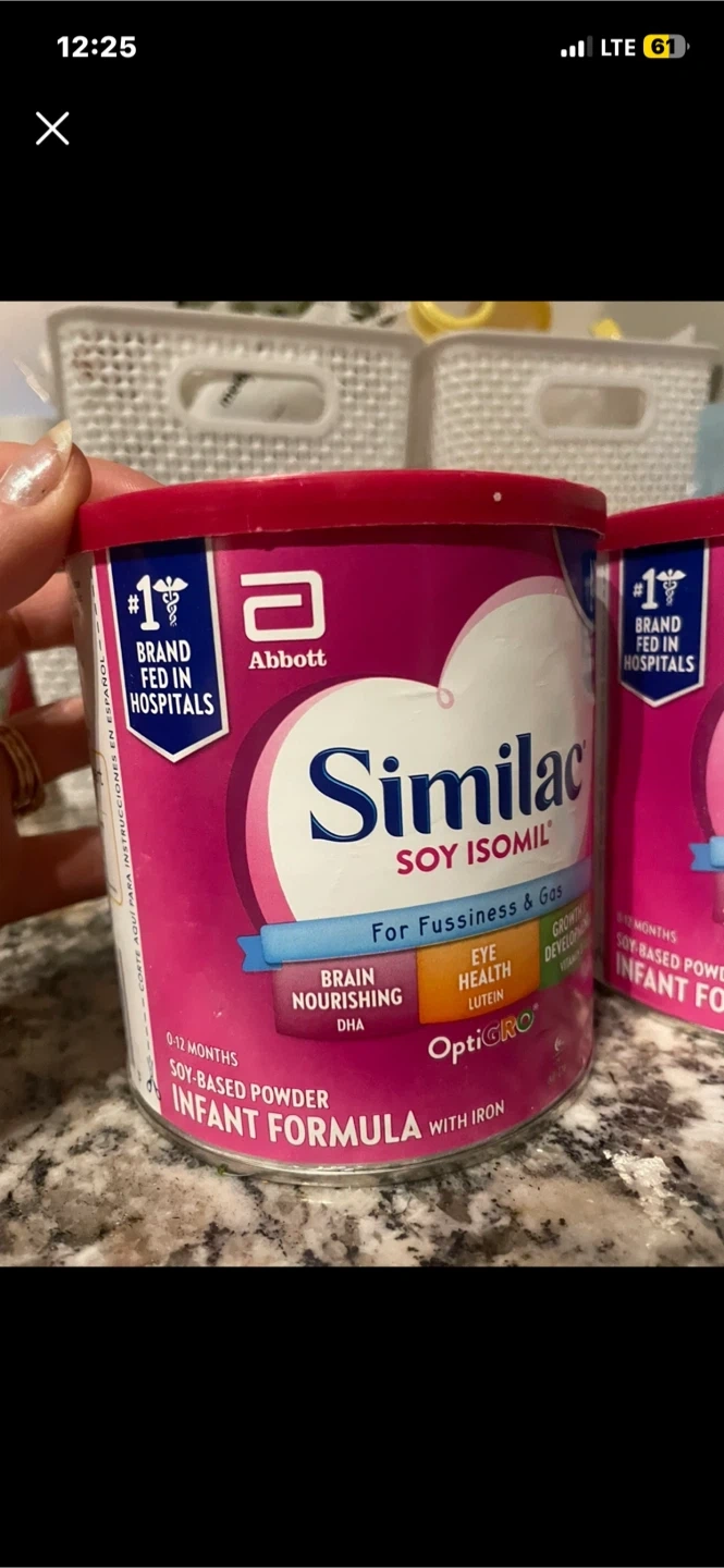 Similac Soy Isomil infant formula. It's designed for fussiness and gas, with OptiGRO for brain nourishing DHA, eye health, and growth and development with Vitamin E. This formula is soy-based and contains iron. Net weight is 12.4 oz (352 g)
