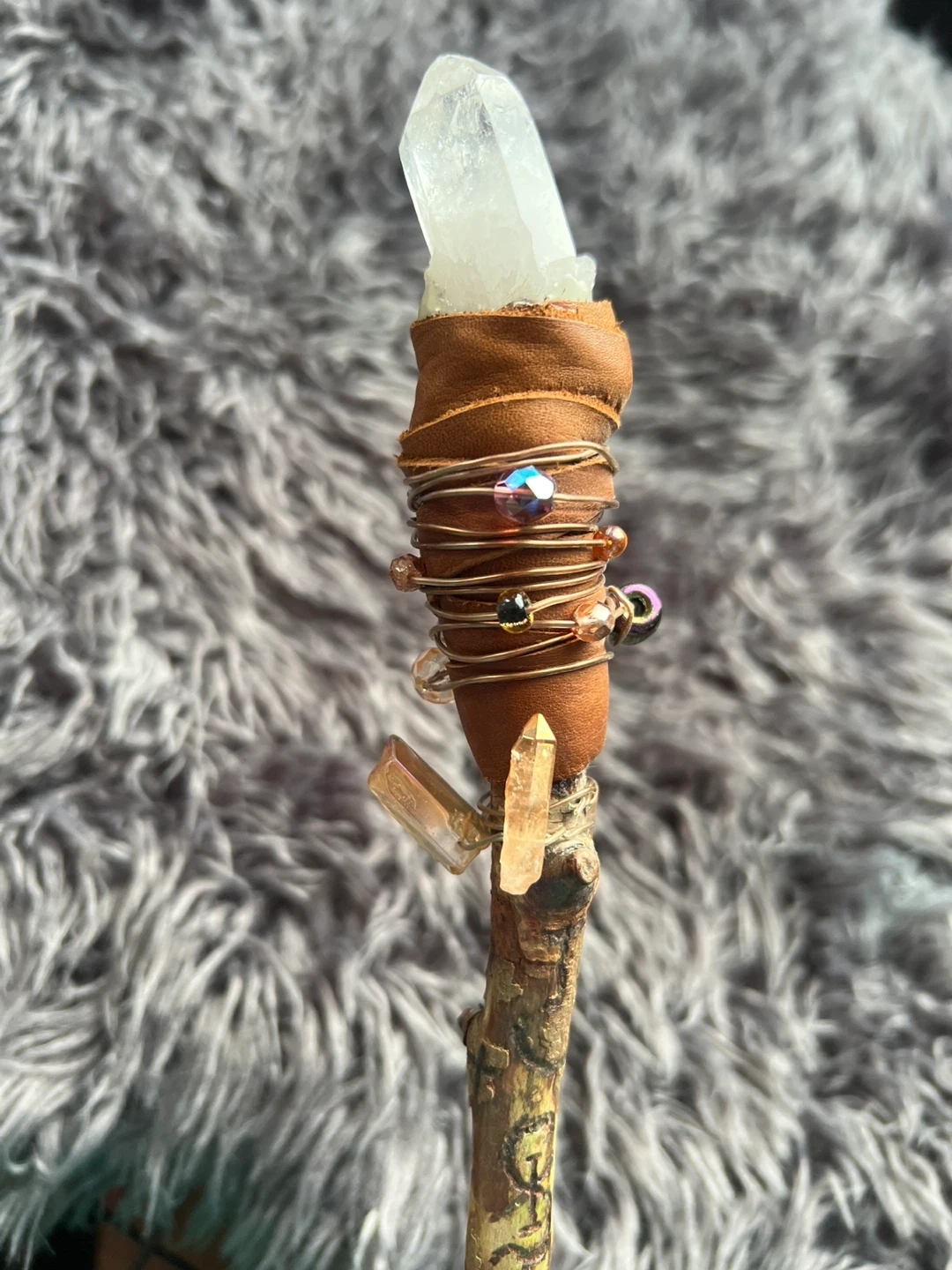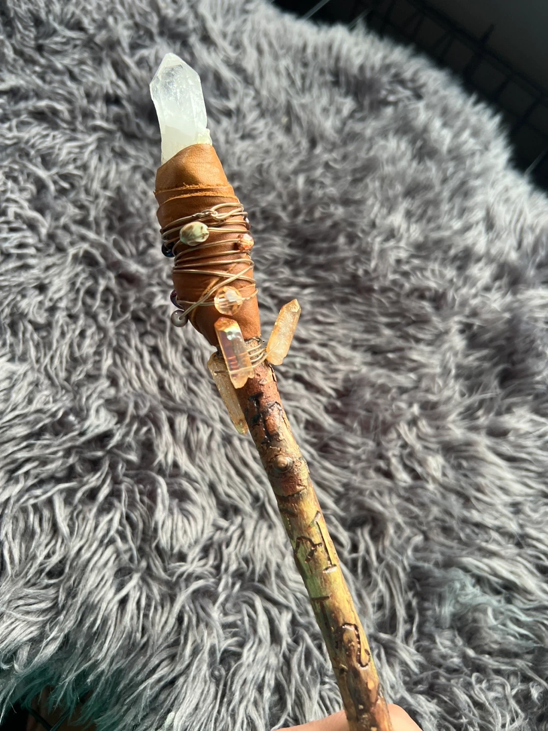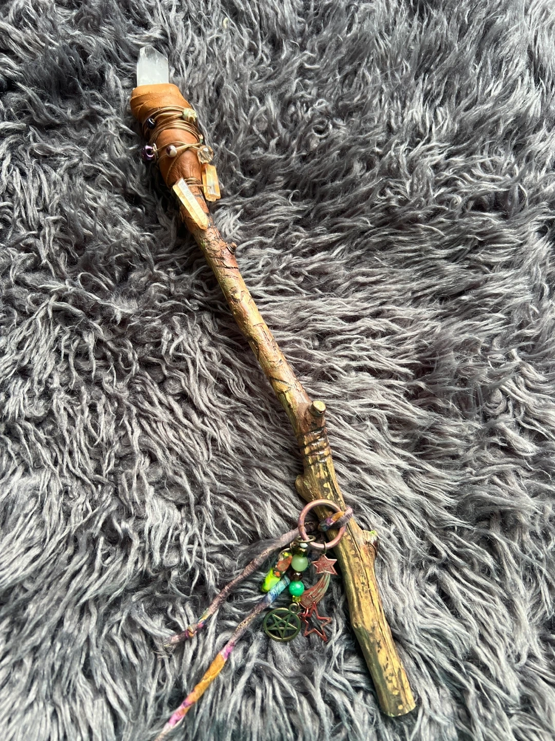 This unique wand is crafted from natural wood and features a clear quartz crystal at the top. Bought at witches market $140.00.