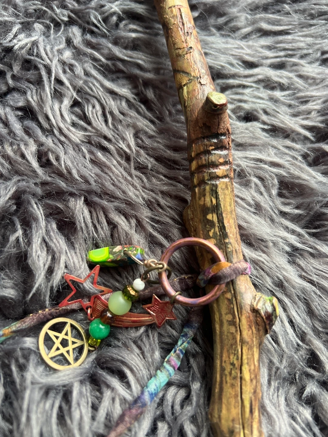 It's adorned with wire wrapping, beads, and several decorative charms including stars and a pentacle. This wand would be great for spiritual practices or as a decorative piece.