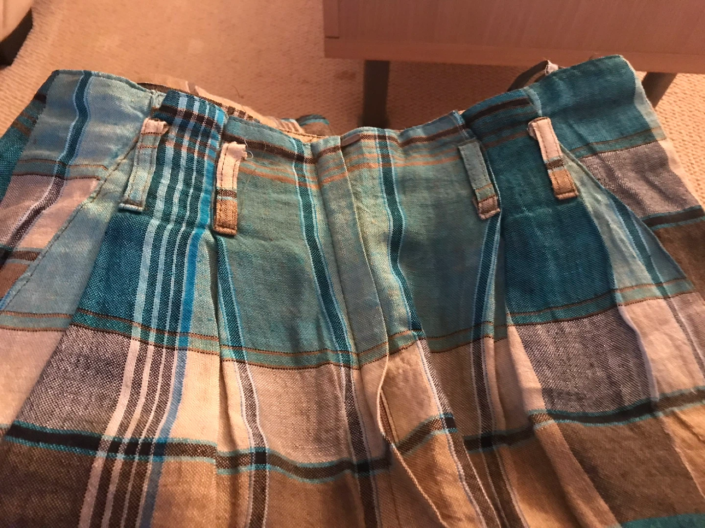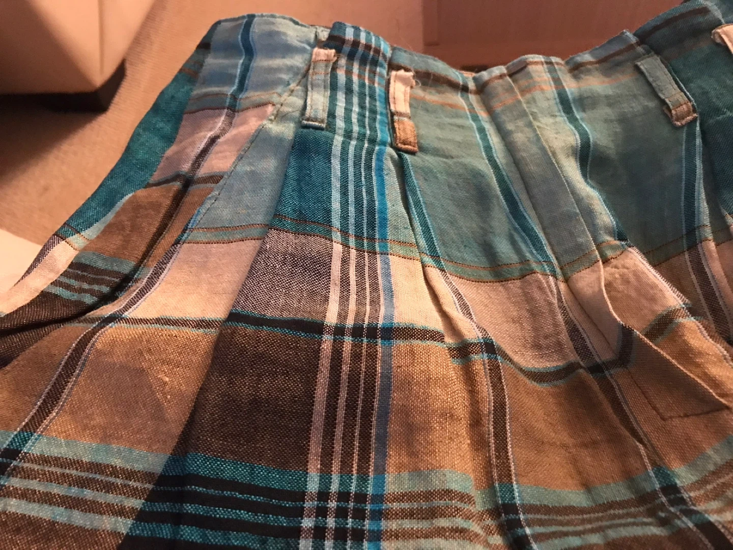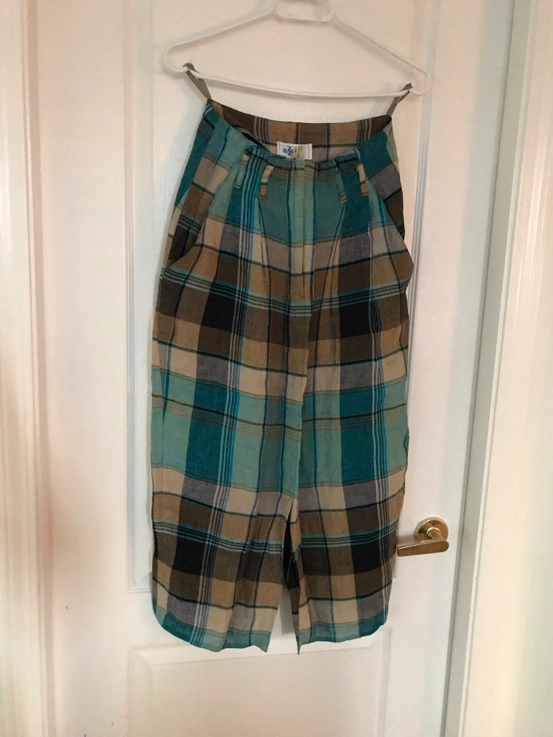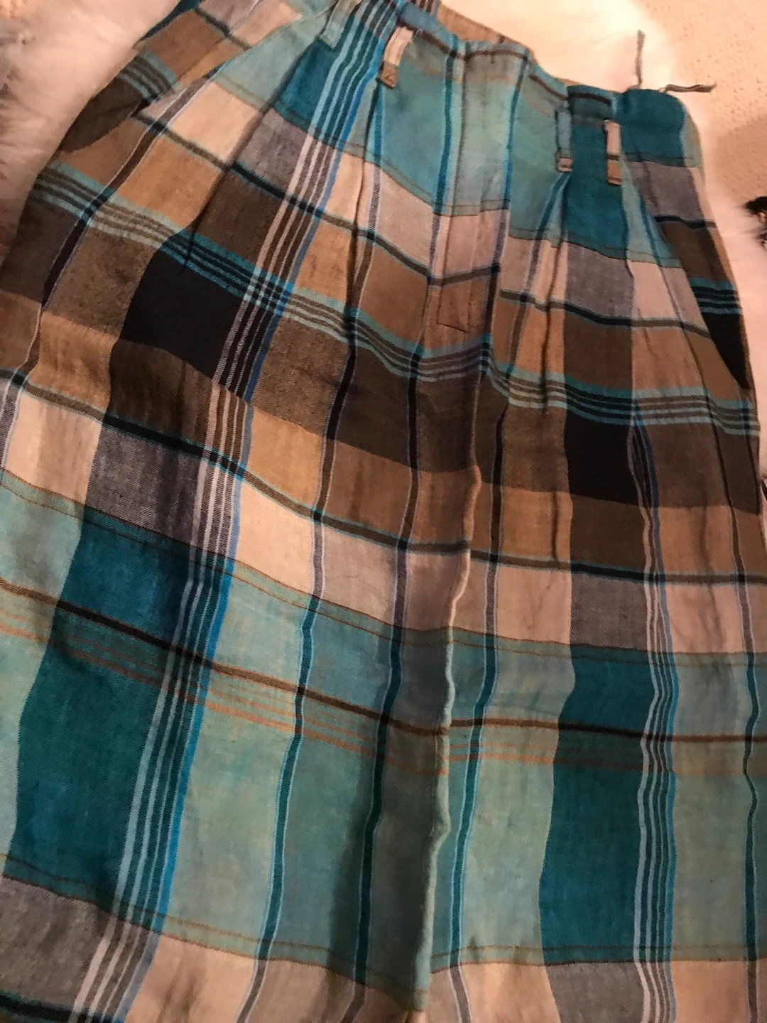 A blue, tan, and brown plaid pleated midi skirt. Features belt loops and zipper closure detail at the waist with a slit in the middle . Perfect for casual wear in 3 seasons.fits size XS . Material is partly linen and it is European made. Great condition.