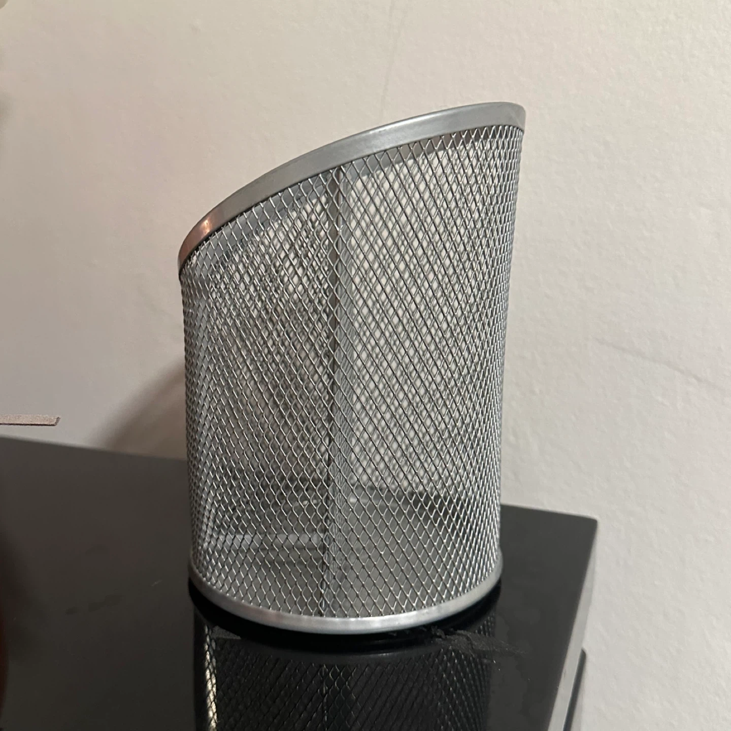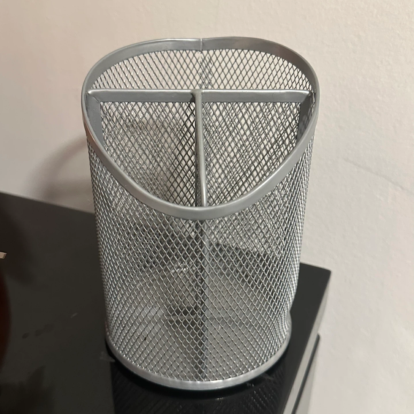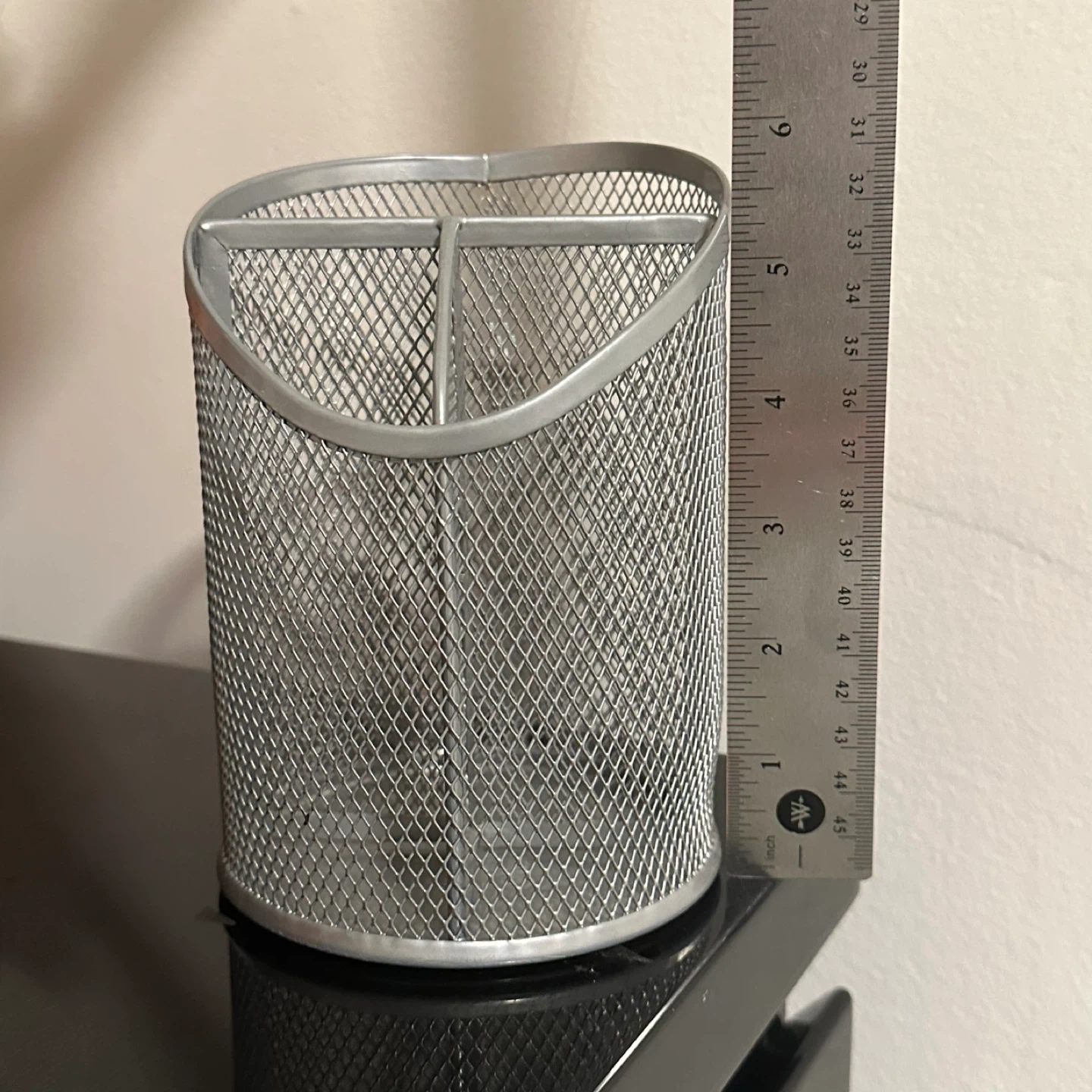 This is a silver mesh desk organizer with three sections. It's about 5 1/2 inches tall. Keeps pens and pencils tidy!