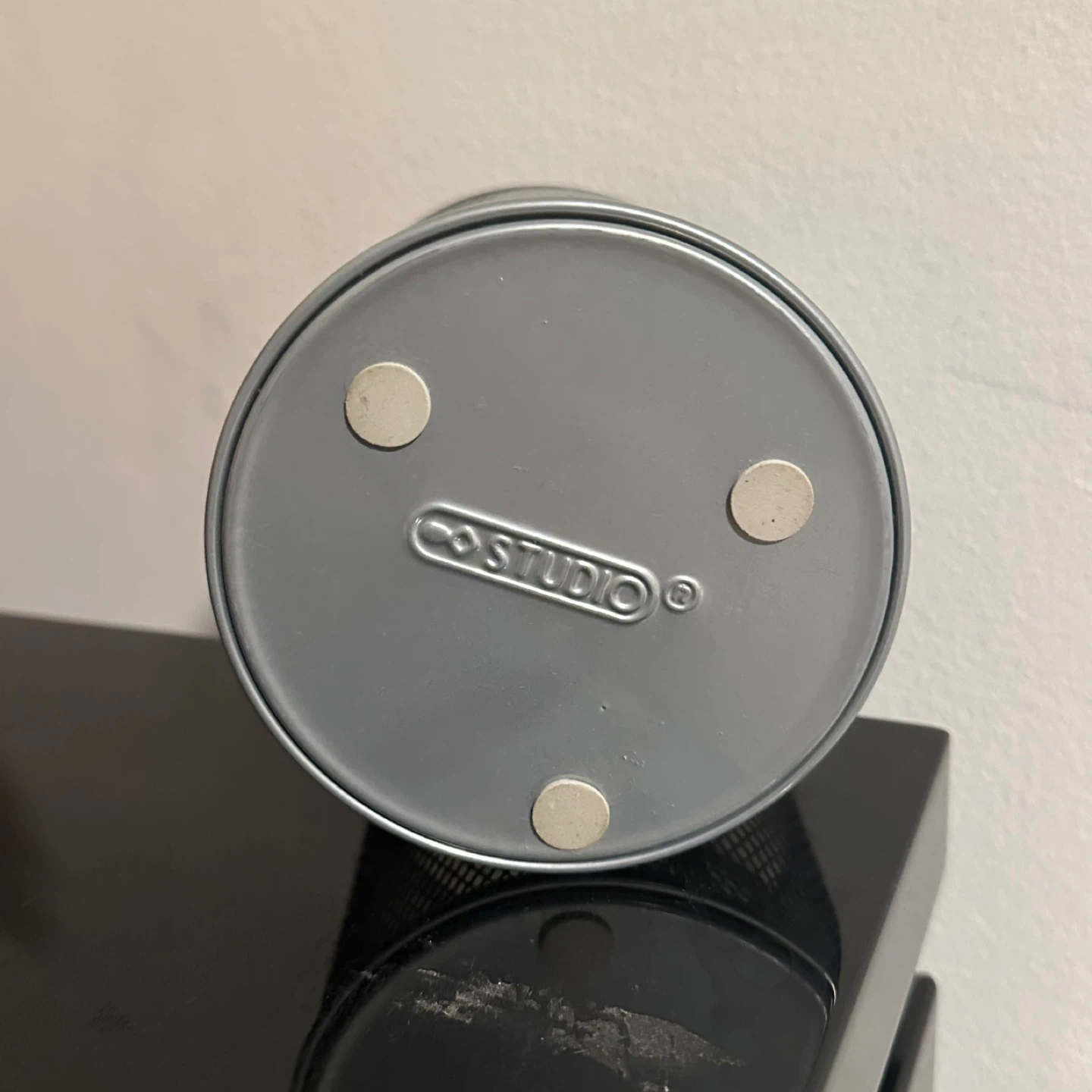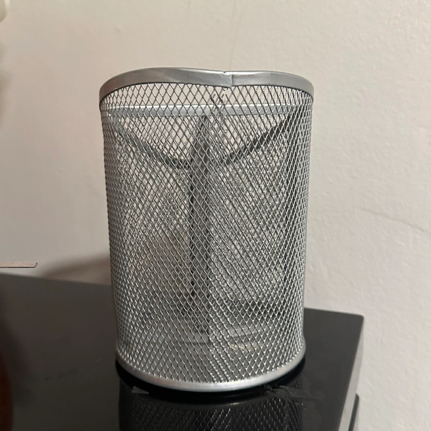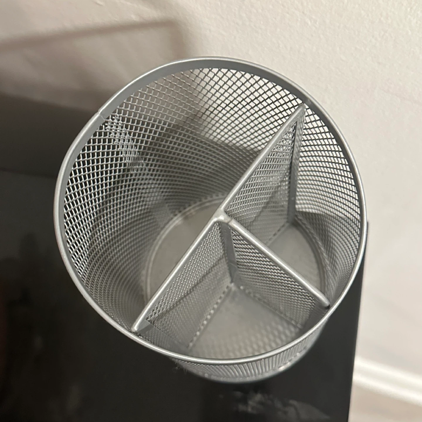This is a silver mesh desk organizer with three sections. It's about 5 1/2 inches tall. Keeps pens and pencils tidy!