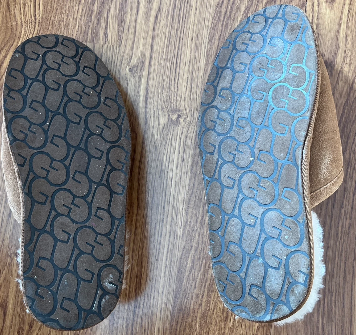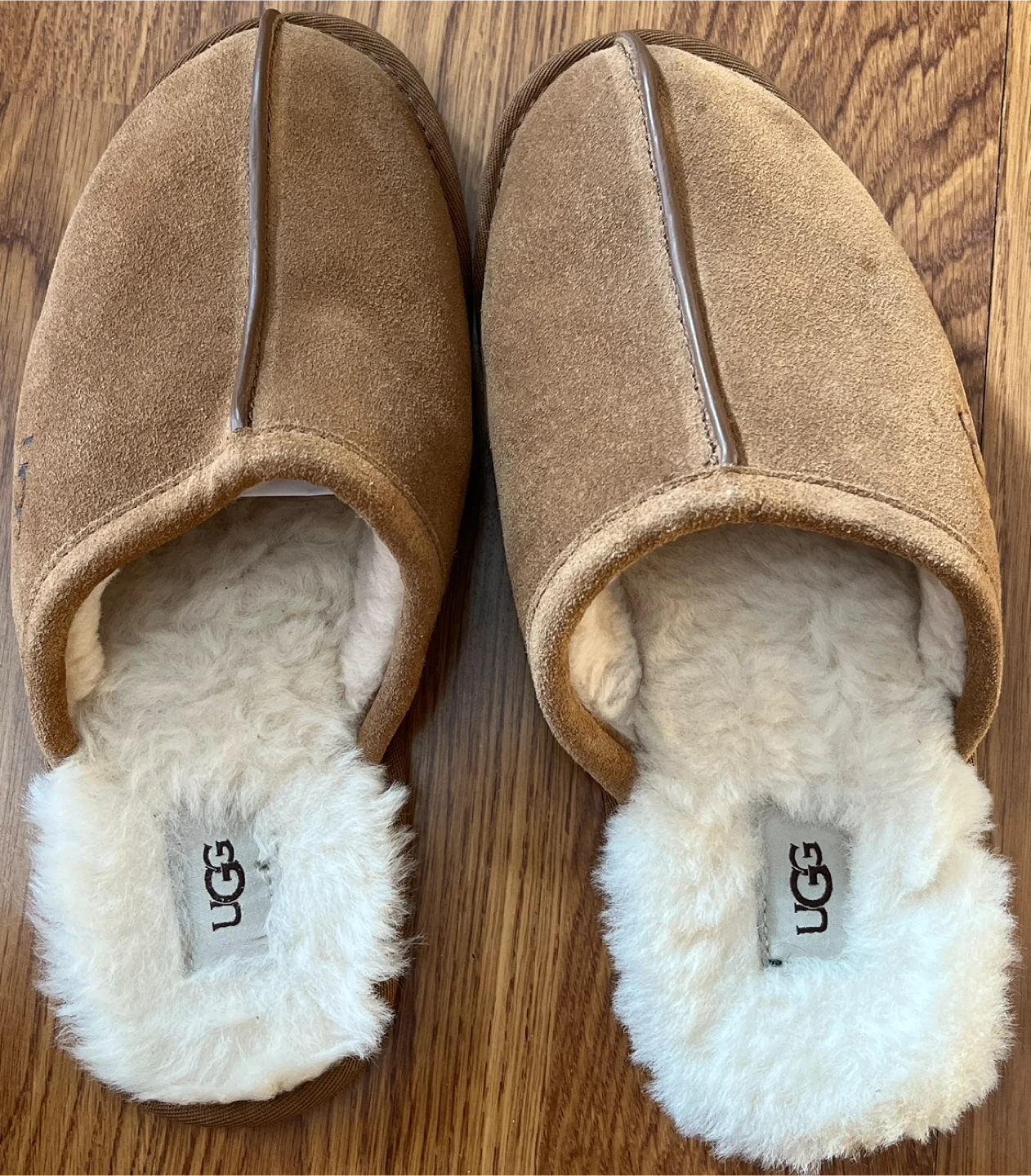 Cozy UGG slippers crafted from suede with a warm sheepskin lining. These slip-on house shoes are perfect for keeping your feet toasty indoors. Features a durable sole for indoor and light outdoor use.