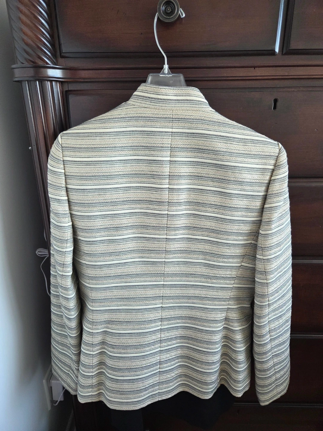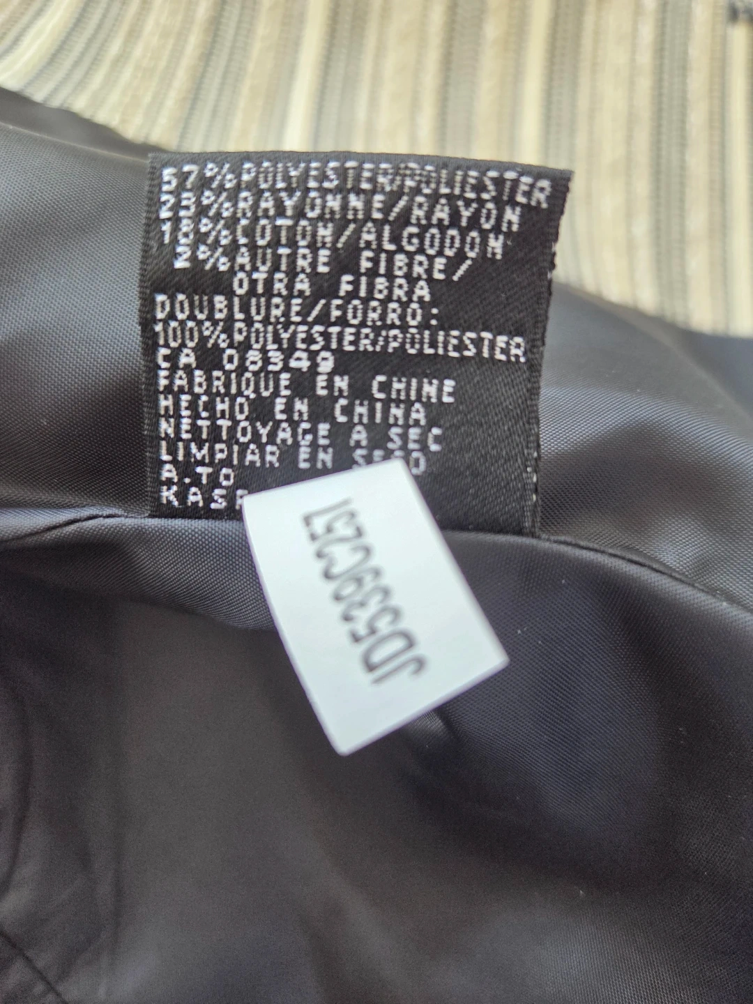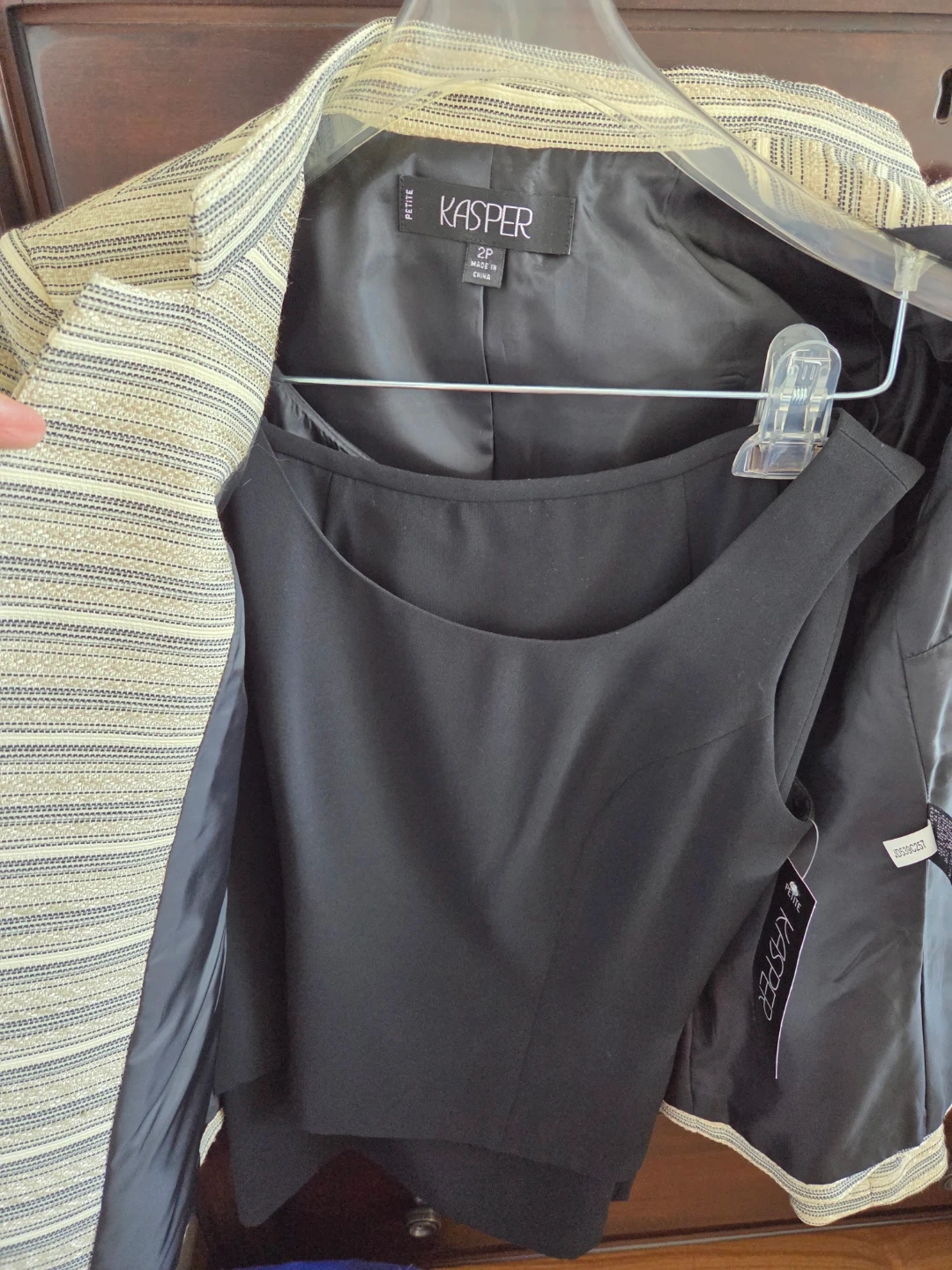This is a Kasper Petite 3-piece suit set featuring a striped blazer and a black sleeveless top. The blazer's fabric is a blend of 57% polyester, 25% rayon, and 18% cotton. It's great for professional or smart-casual occasions!
