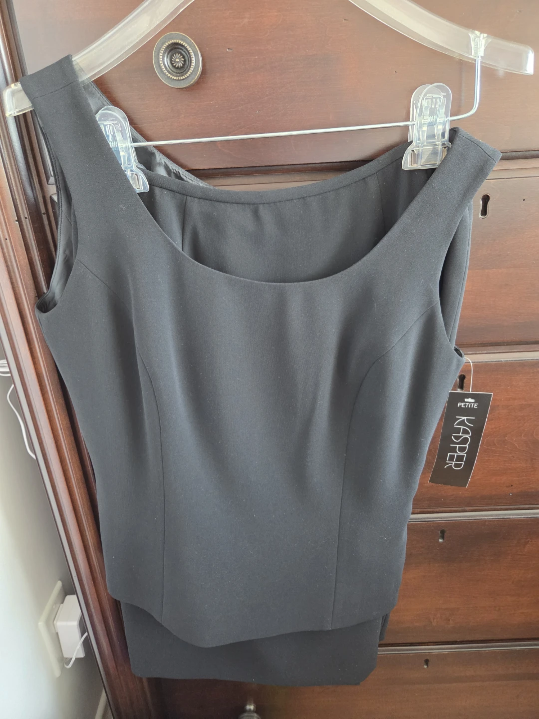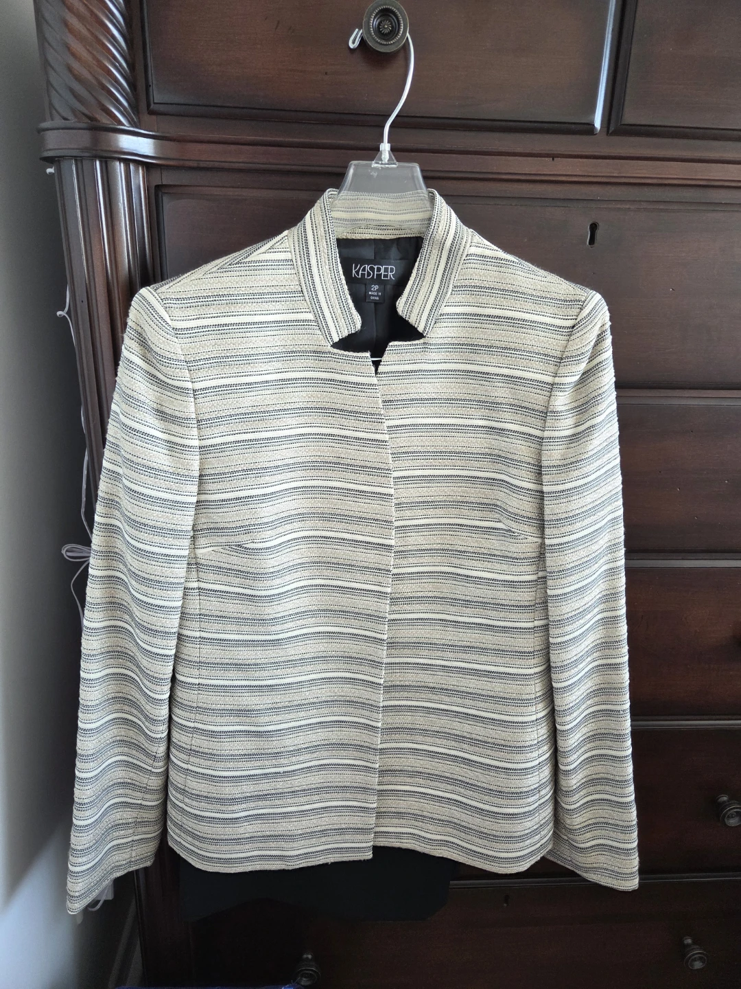 This is a Kasper Petite 3-piece suit set featuring a striped blazer and a black sleeveless top. The blazer's fabric is a blend of 57% polyester, 25% rayon, and 18% cotton. It's great for professional or smart-casual occasions!