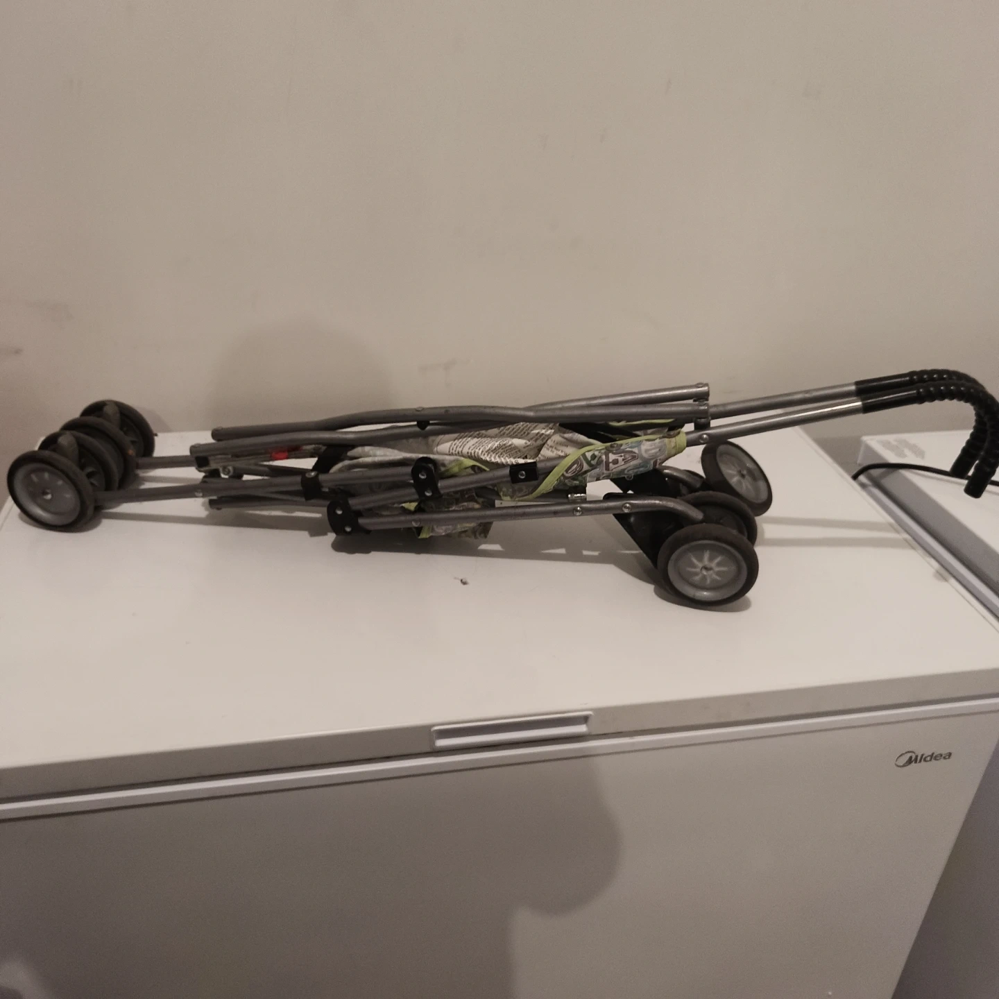 This is a convenient lightweight stroller. It's foldable for easy storage and transport. The stroller features a durable metal frame and four wheels for smooth maneuverability. It's great for quick trips out.