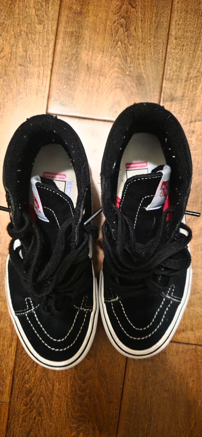 Black Vans Sk8-Hi Pro shoes. These are high-top skate shoes. They're made with durable suede and canvas uppers.