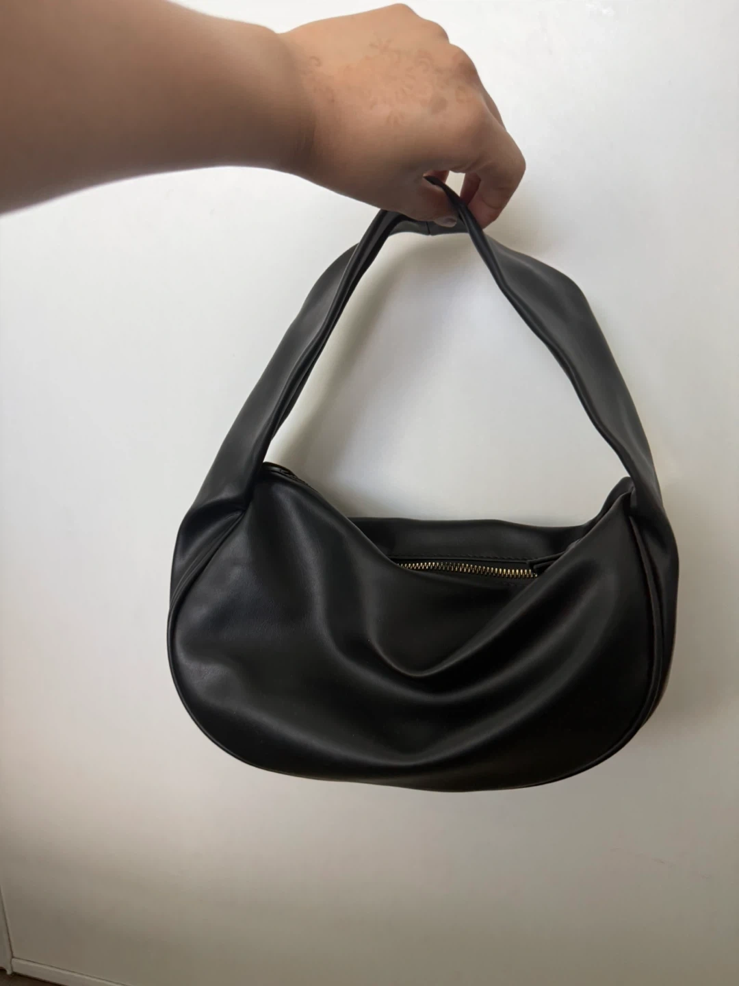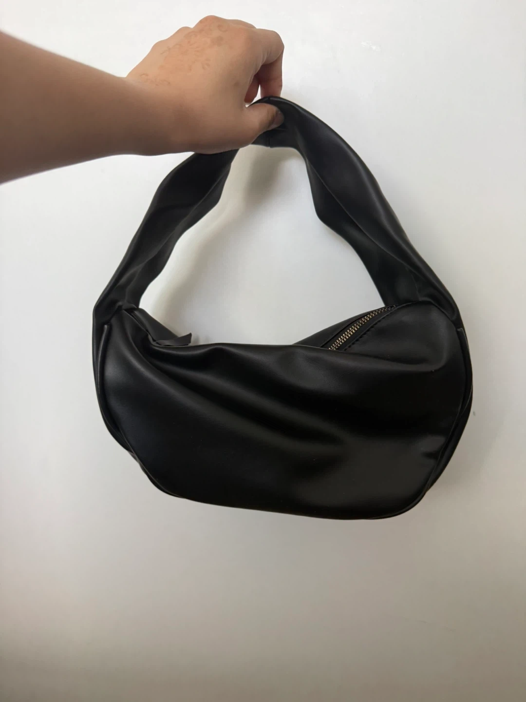 This stylish shoulder bag is made from black faux leather. It features a zippered closure and a comfortable shoulder strap. It's a versatile accessory for everyday use!
