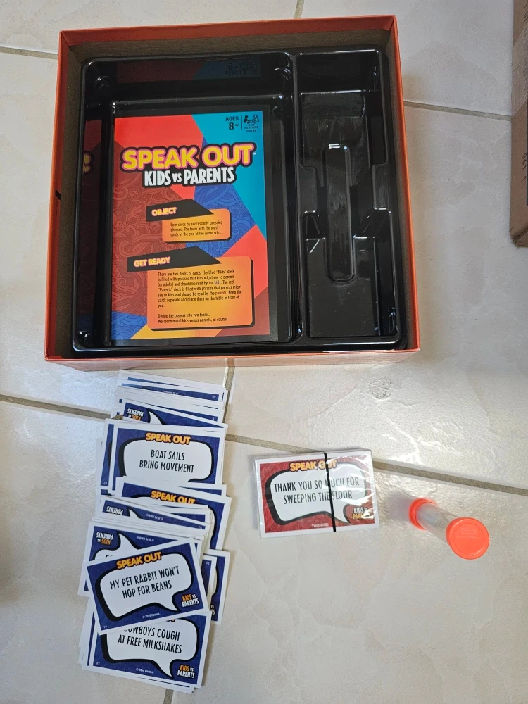 It's the ridiculous mouthpiece challenge game for the family. This game includes game cards, extra sets of mouthpieces, and an hourglass. 1 set of cards is unopened.
