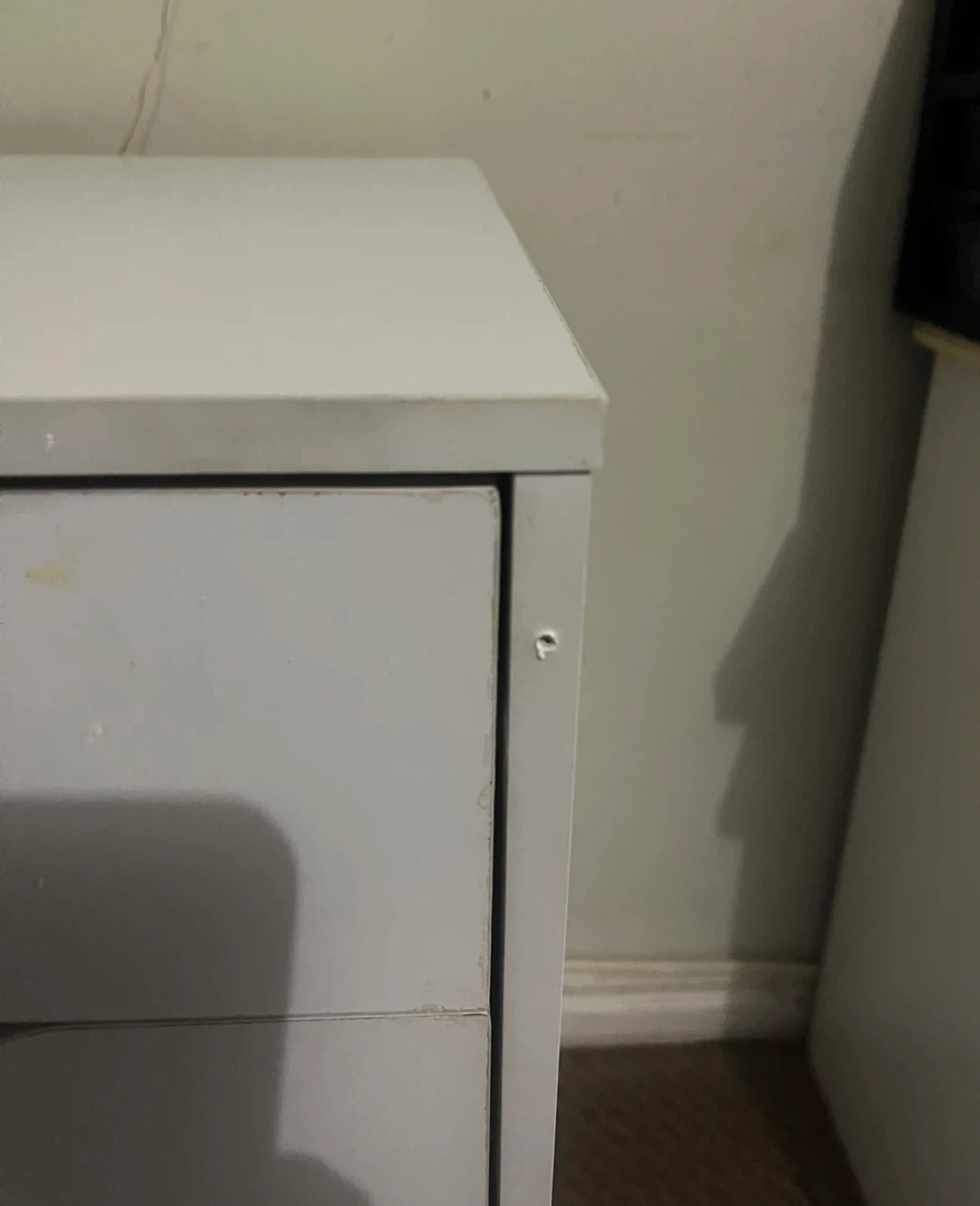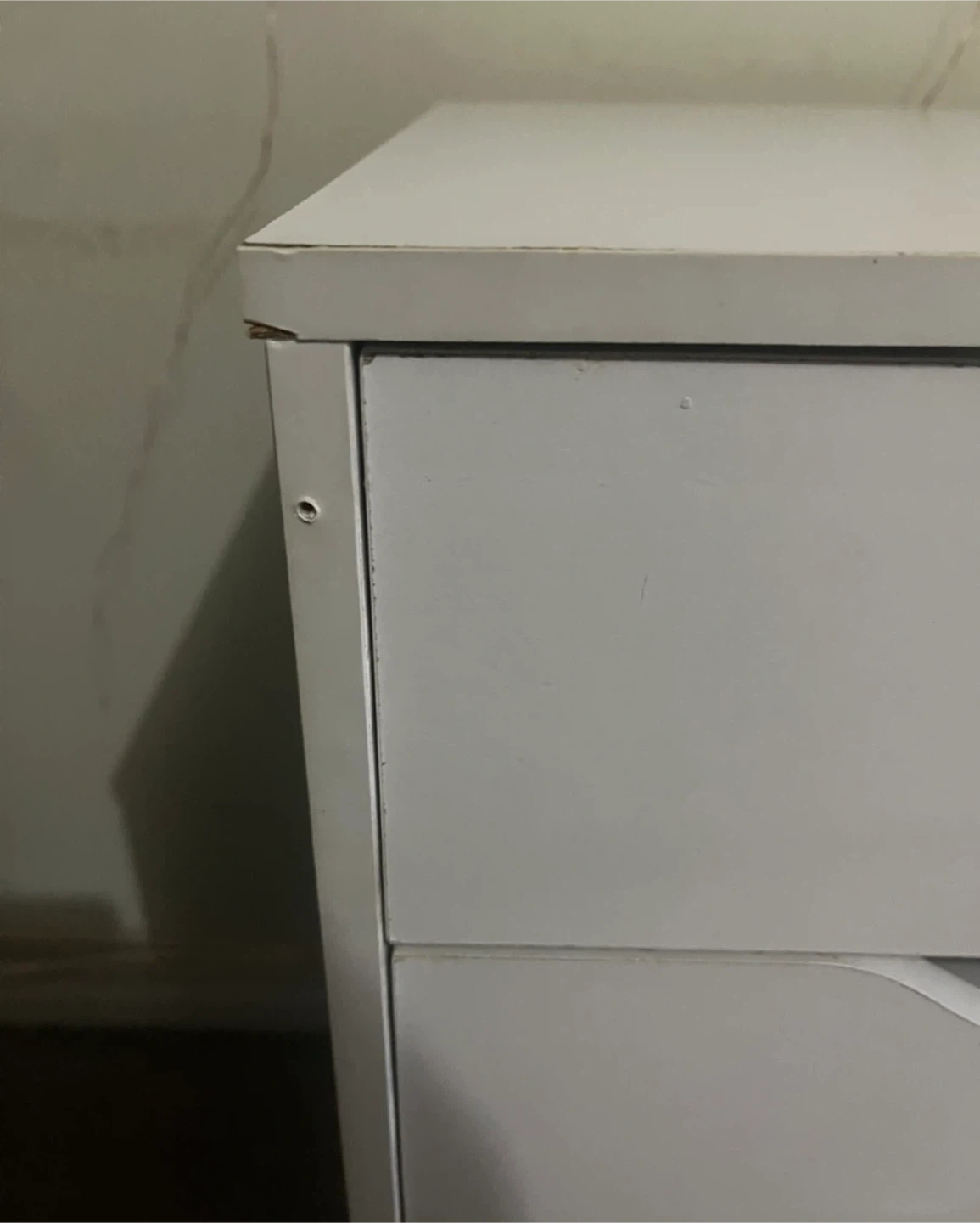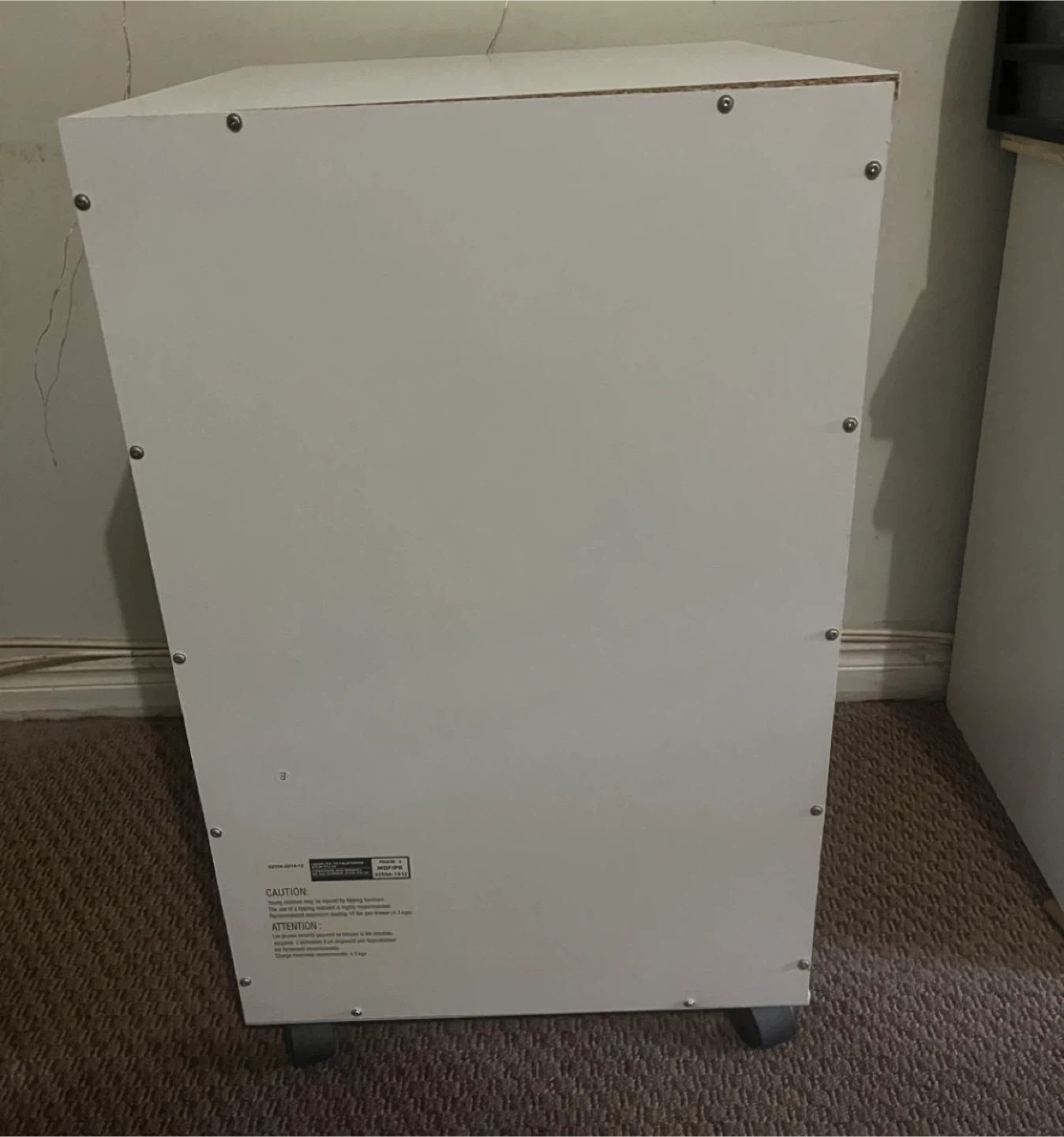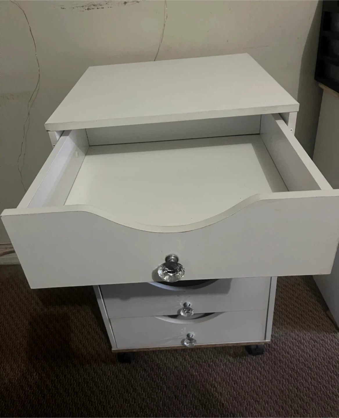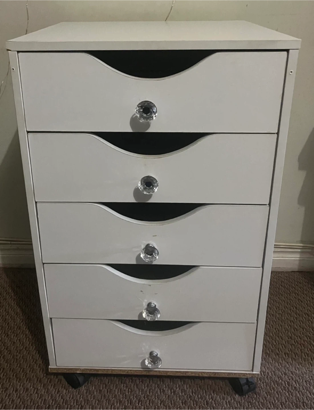 White rolling storage cart with five drawers. Each drawer has a clear crystal-look knob. It's on wheels for easy movement. Come with extra parts as seen in last photo