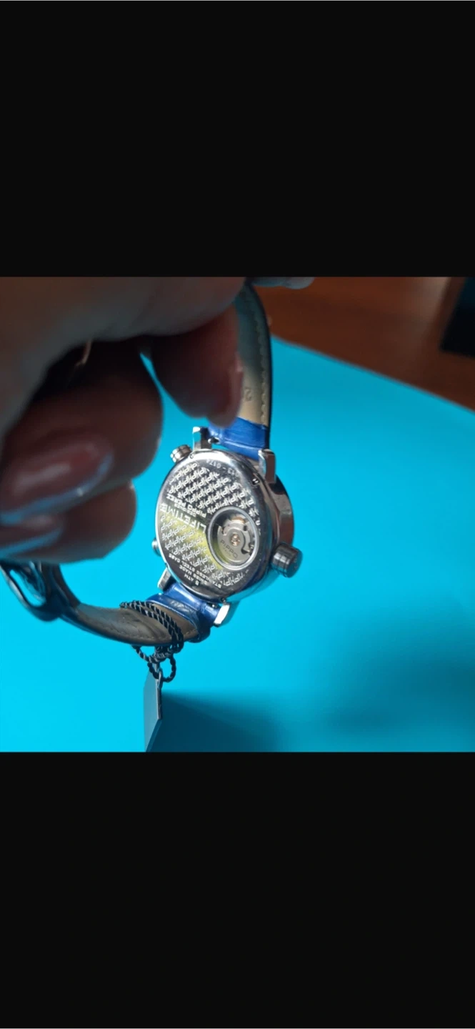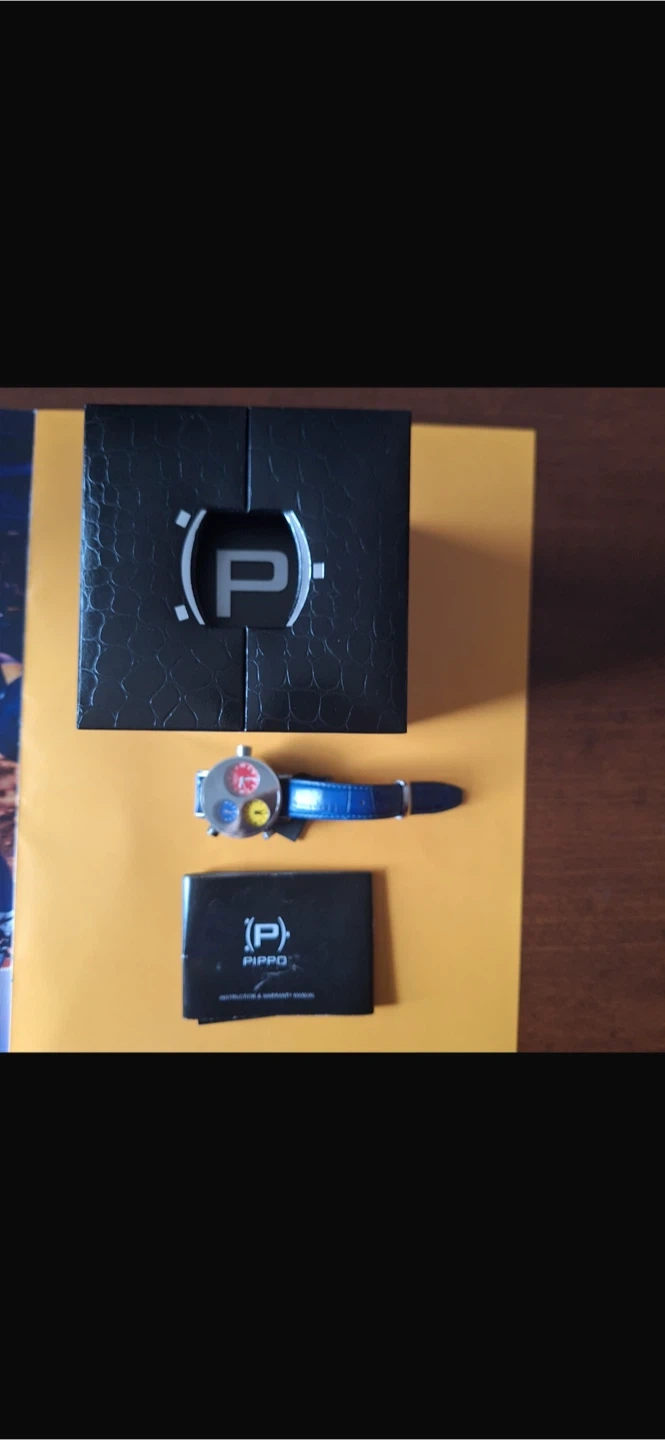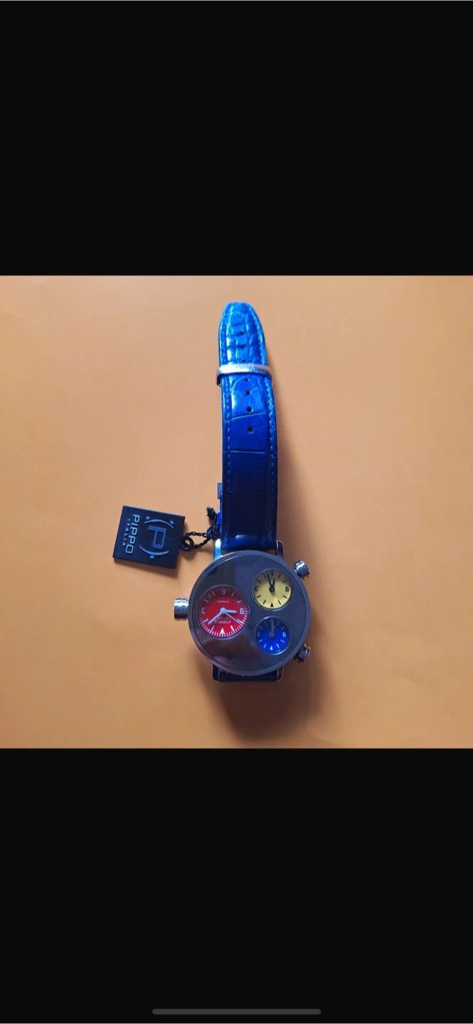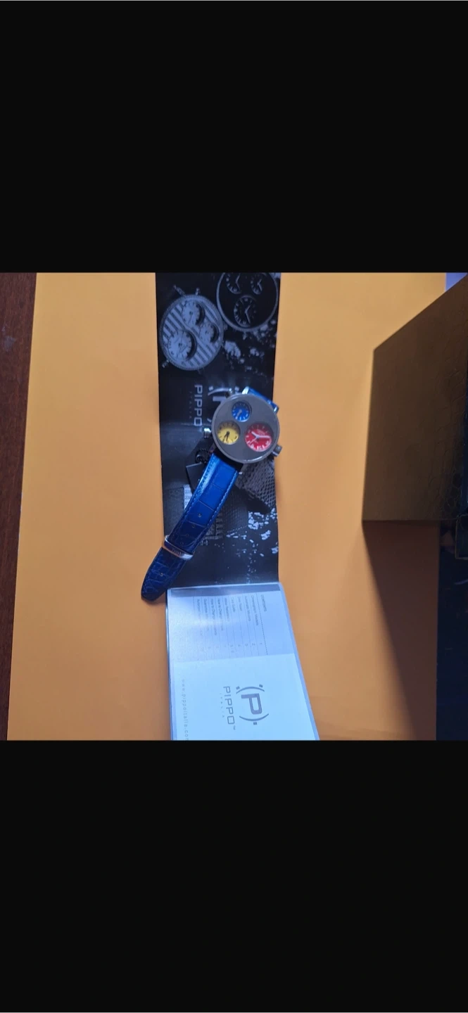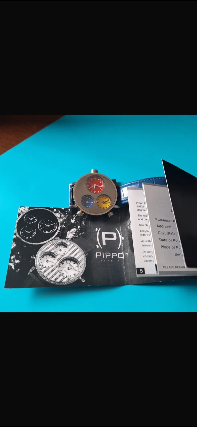 Pippo Italia wristwatch with a blue alligator-style leather band. It has a silver-tone case with three separate coloured dials. Includes original box and instruction manual. Stainless steel back, water resistant 3 ATM.