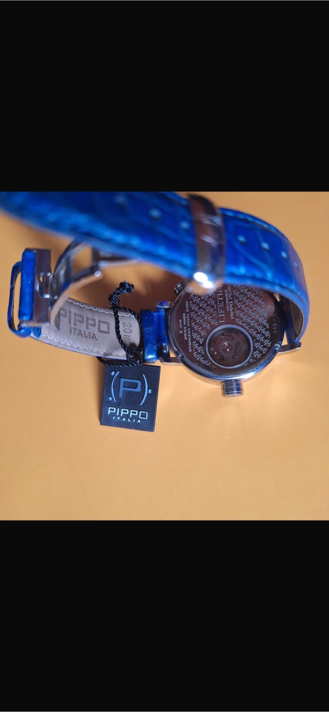 Pippo Italia wristwatch with a blue alligator-style leather band. It has a silver-tone case with three separate coloured dials. Includes original box and instruction manual. Stainless steel back, water resistant 3 ATM.