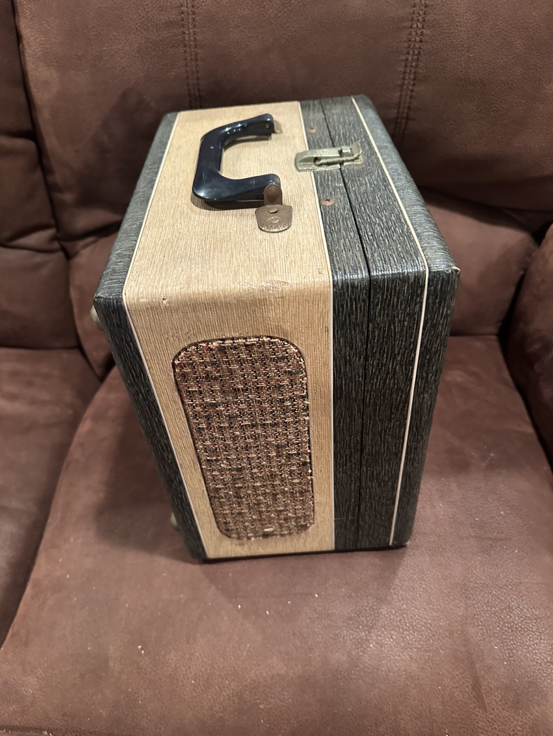 Vintage Portable reel-to-reel tape player. Includes case. Features record, play, rewind, and fast forward functions. Great for collectors.
