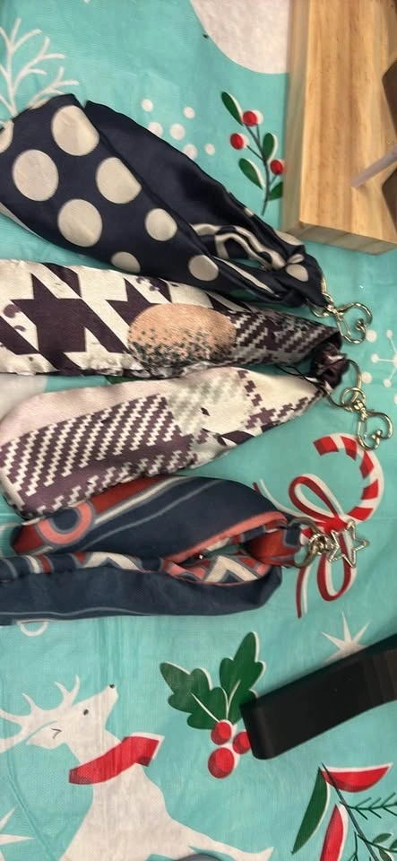 These are unique purse charms crafted from upcycled vintage scarves. Each one is a one-of-a-kind accessory to add a special touch to your bag. Let me know if you're interested!