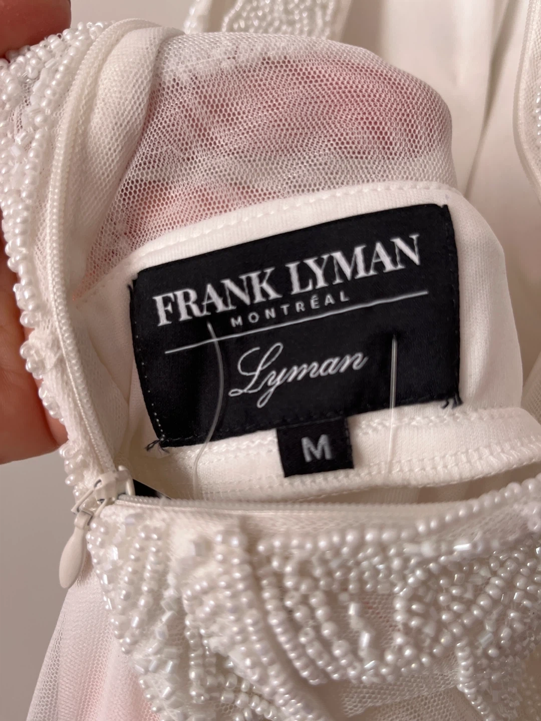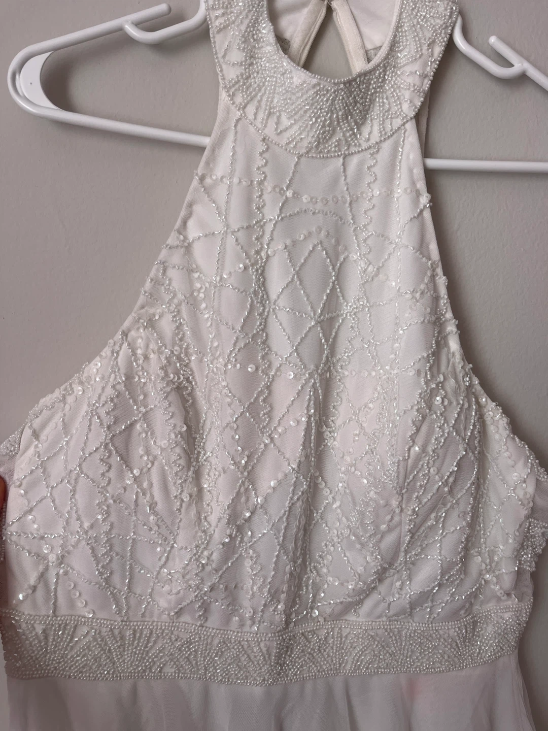 This is a beautiful white halter neck dress by Frank Lyman. It features intricate beading on the bodice and neckline. Size is medium.