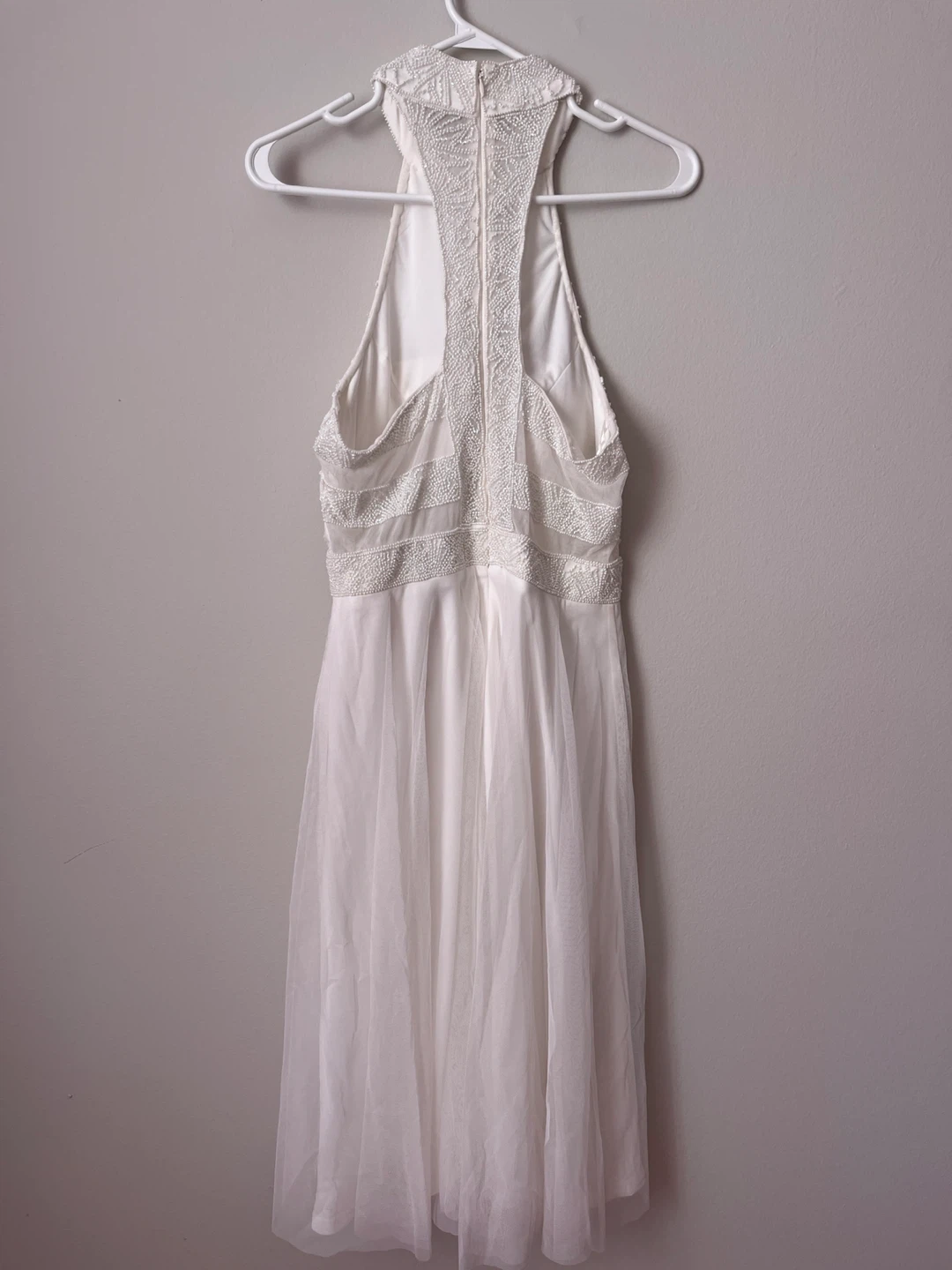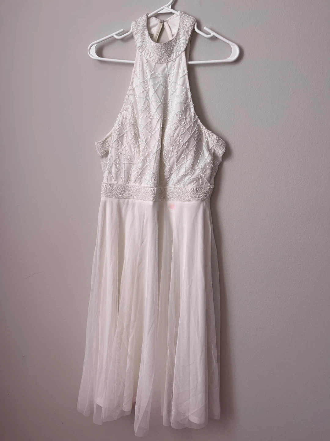 This is a beautiful white halter neck dress by Frank Lyman. It features intricate beading on the bodice and neckline. Size is medium.