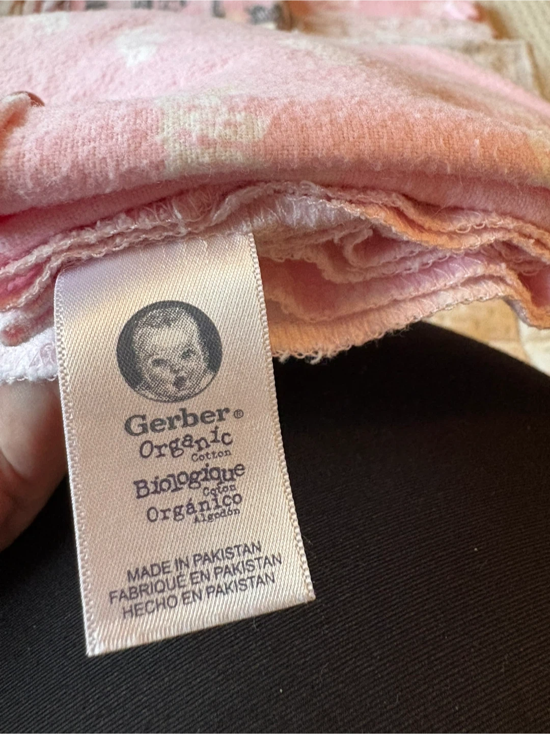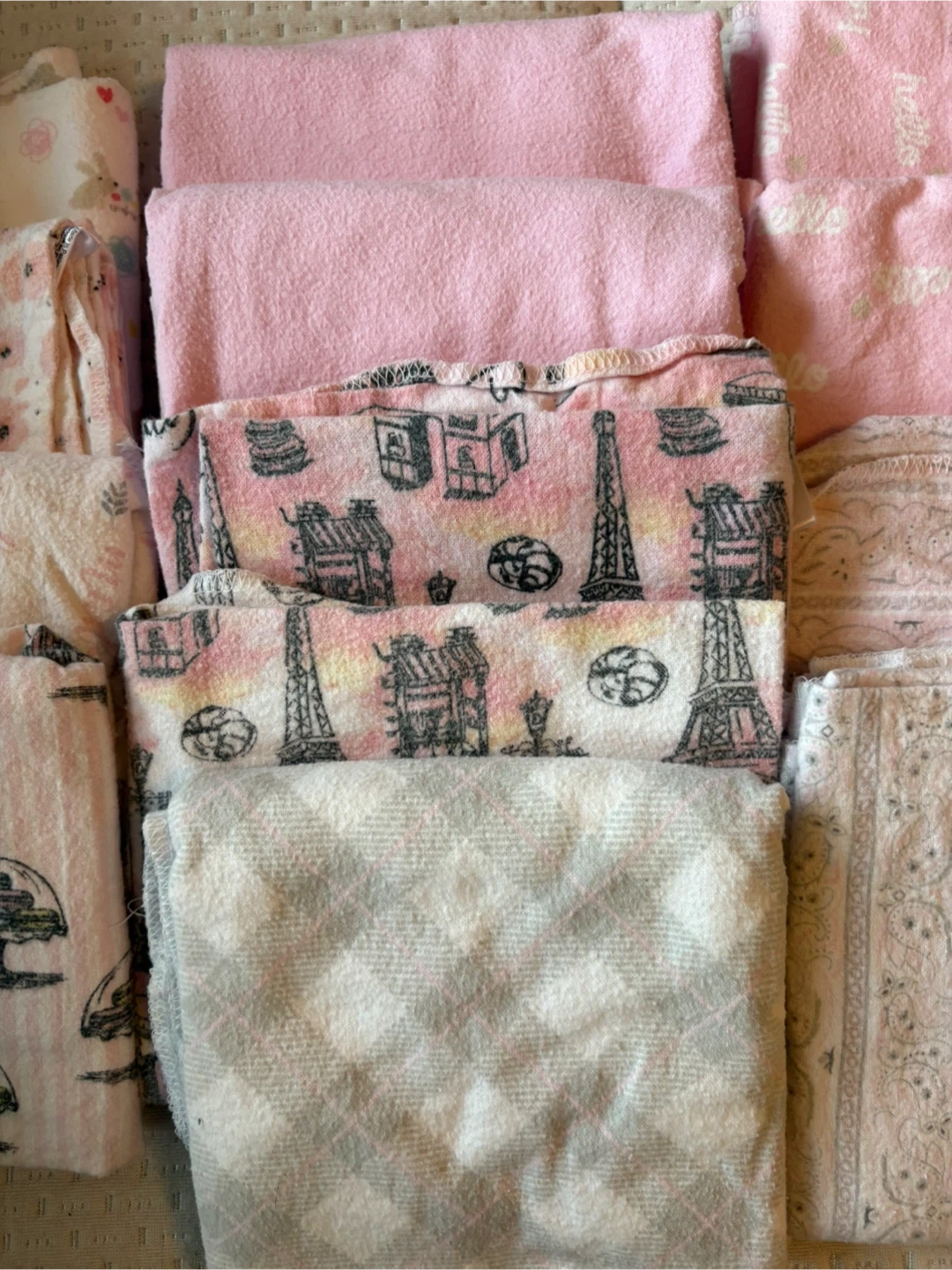 Set of eight Gerber Organic cotton baby swaddle blankets. Variety of pink and white patterns including Eiffel Tower and floral designs. Made in Pakistan.