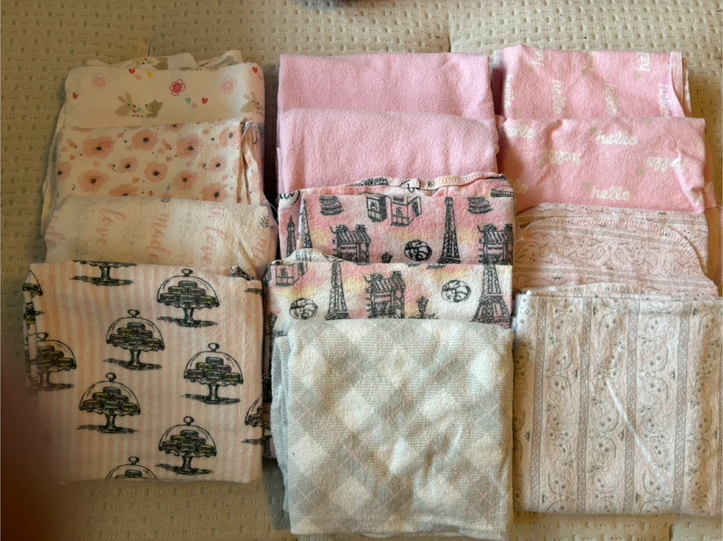 Set of eight Gerber Organic cotton baby swaddle blankets. Variety of pink and white patterns including Eiffel Tower and floral designs. Made in Pakistan.