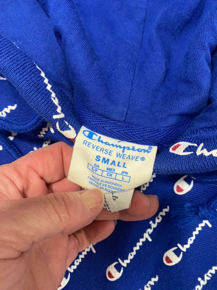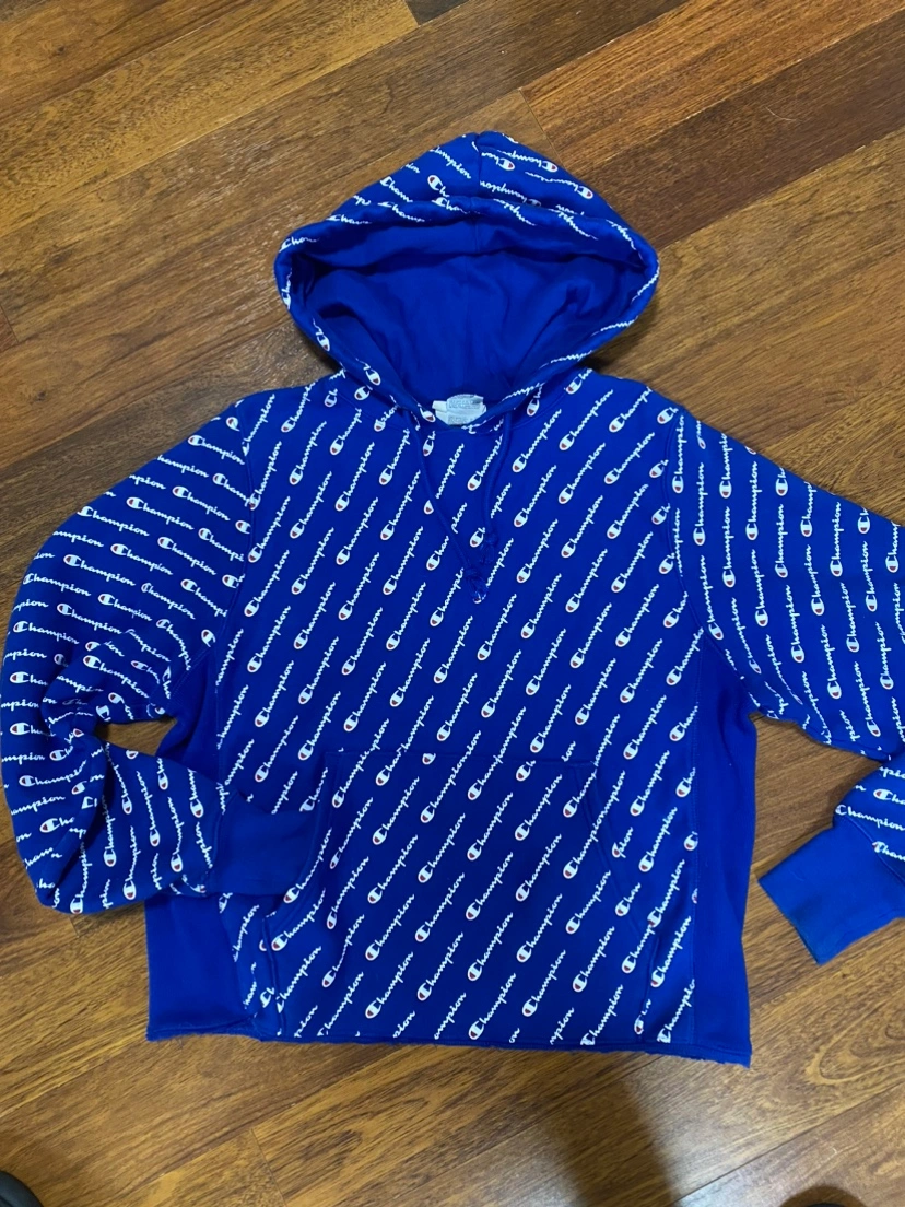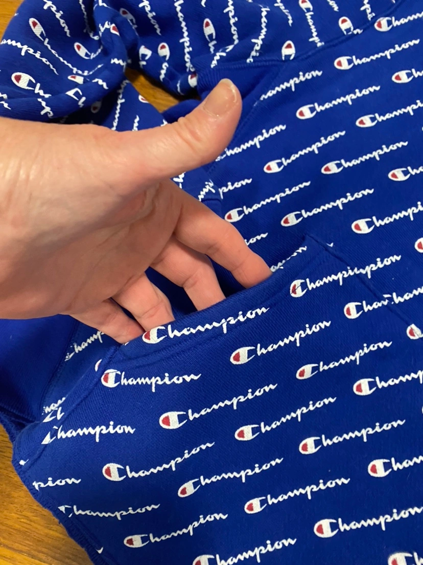 Blue Champion hoodie with the logo all over. It has a pouch pocket on the front and a hood. It’s fits nice and loose in excellent condition. Very warm. TEEN/LADIES size small