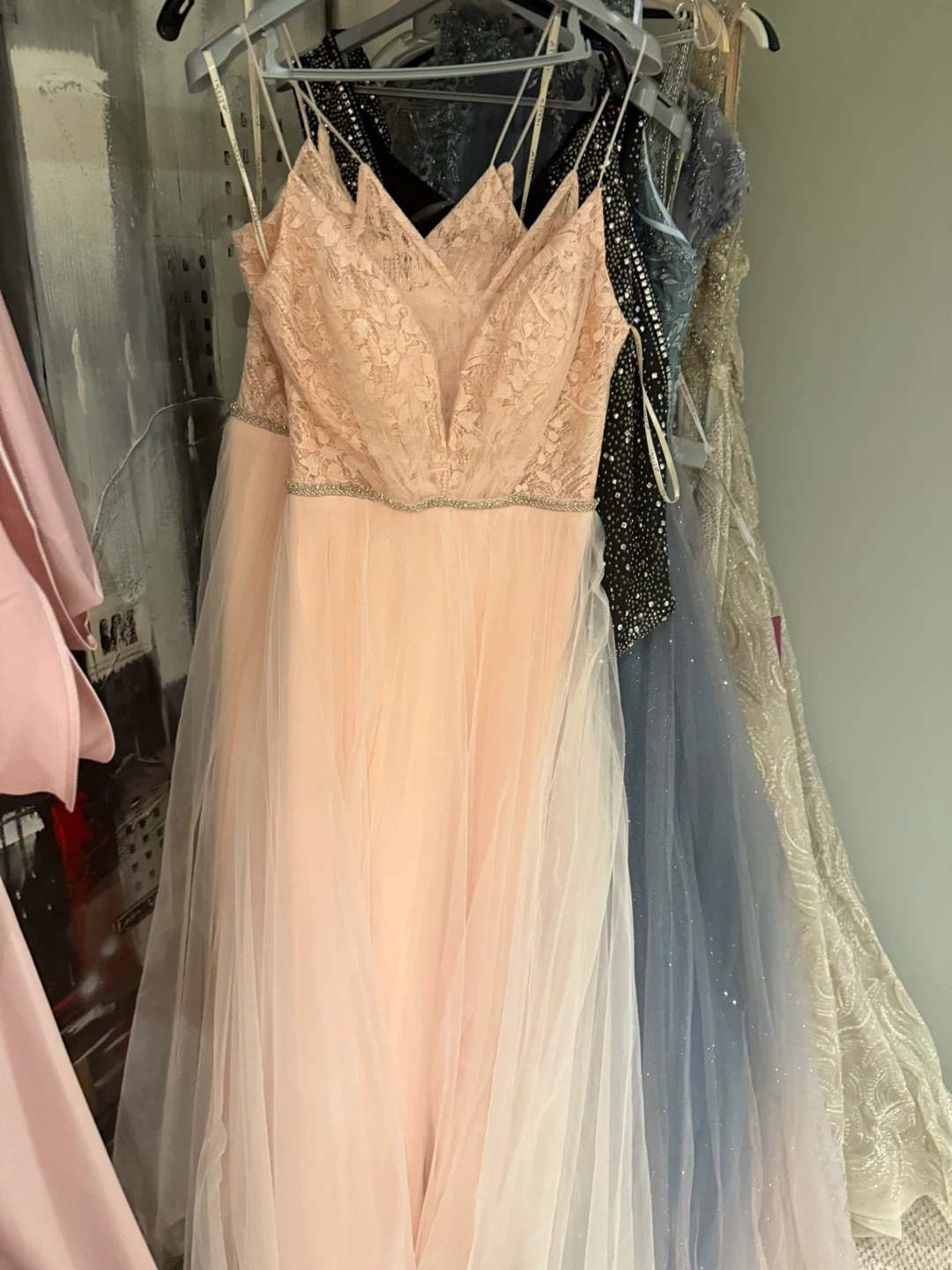 This lovely light pink prom dress features a delicate lace bodice with spaghetti straps and a shimmering beaded waistband. Its flowing tulle skirt creates an elegant silhouette. It's perfect for formal events and graduations!