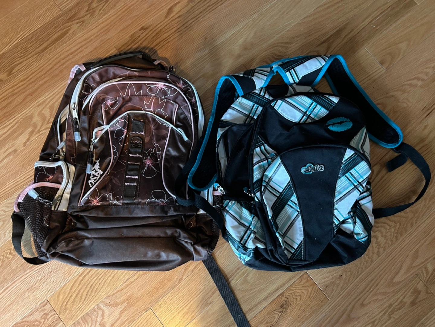 Pair of used backpacks. One brown with floral print, one black and white plaid. Both have multiple compartments. Great for school or day trips.