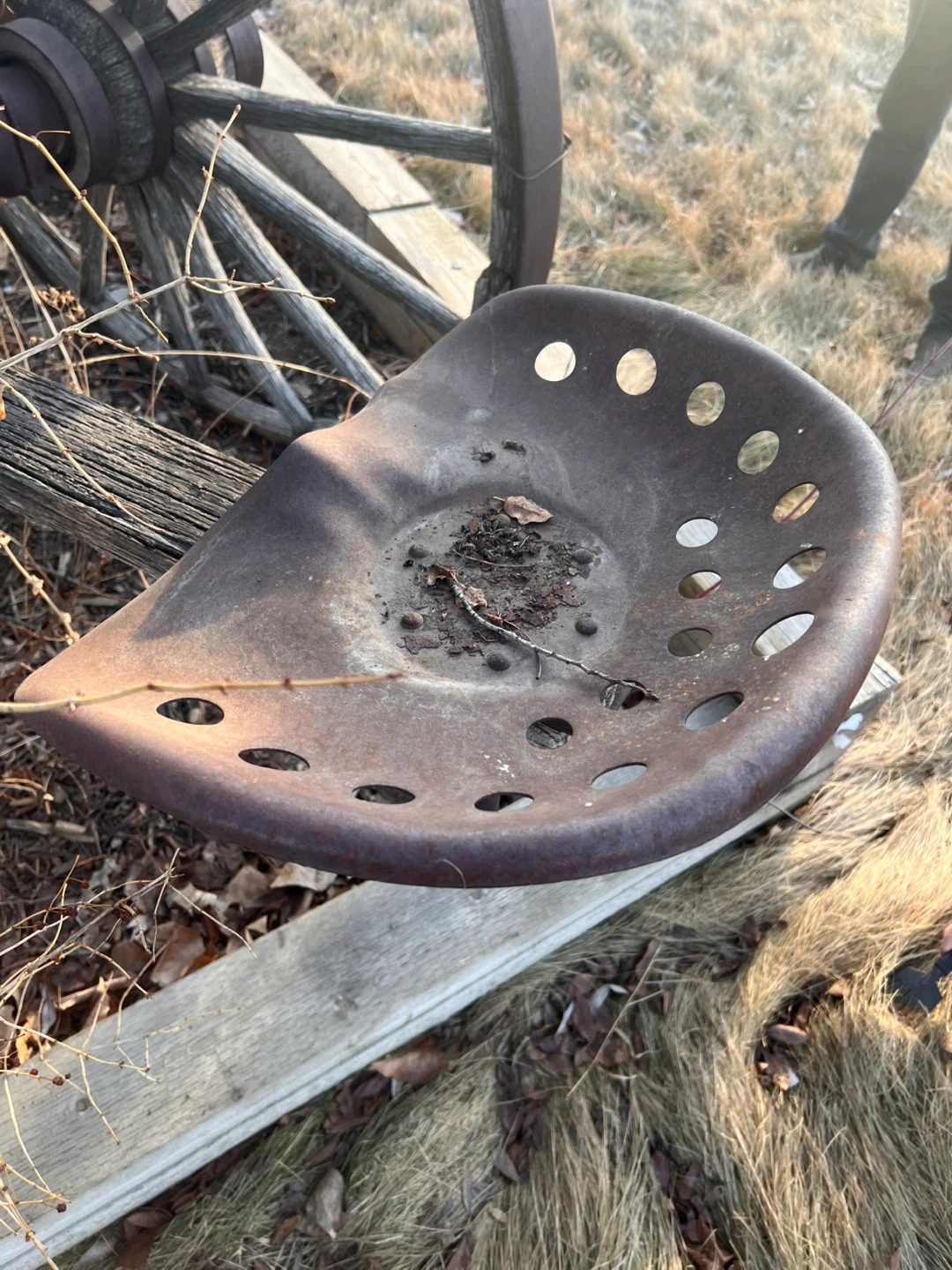 This is a rusty metal tractor seat with a perforated design. It's a classic piece, perfect for repurposing or display. Its sturdy metal construction is built to last.