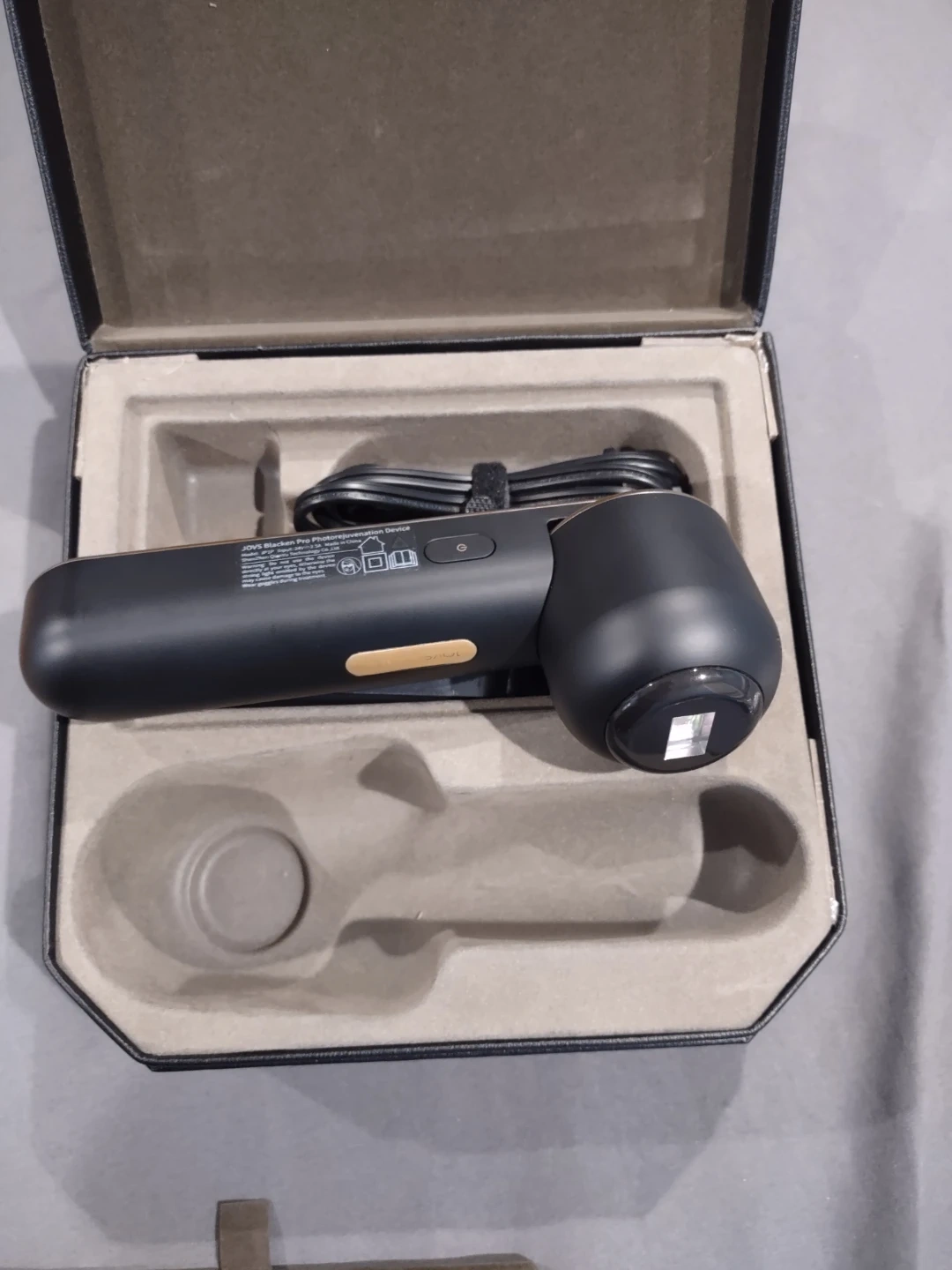This is the JOVS Skin Photonic Rejuvenation Device. It's designed for skin treatments. Includes a charging cable, power adapter, and original case.