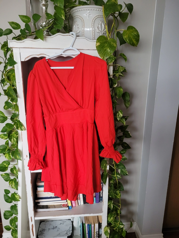 V-neckline, long sleeves with elastic cuffs, mini length. Relaxed fit. Lightweight material.
