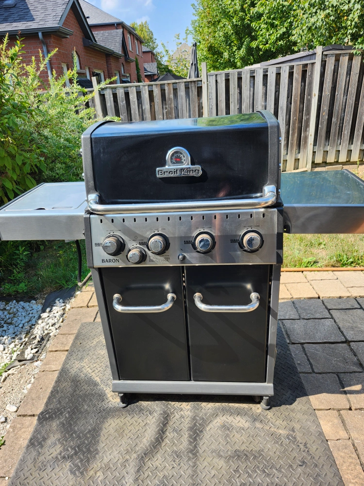 Four-burner Broil King Baron propane barbecue. Features stainless steel cookbox and side shelves. Includes propane tank. Great for backyard cooking!