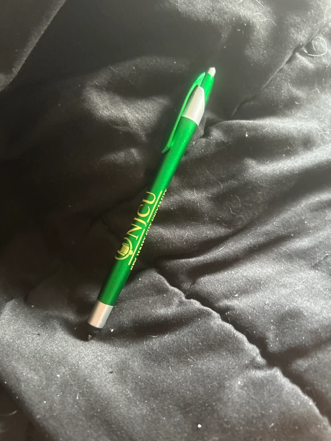 Free pens NJCU pen This is a green pen with the NJCU logo. It's from New Jersey City University. The pen has a silver tip and clip. It writes smoothly!