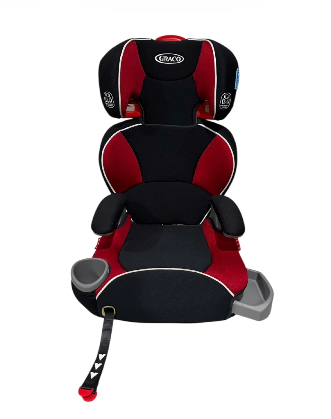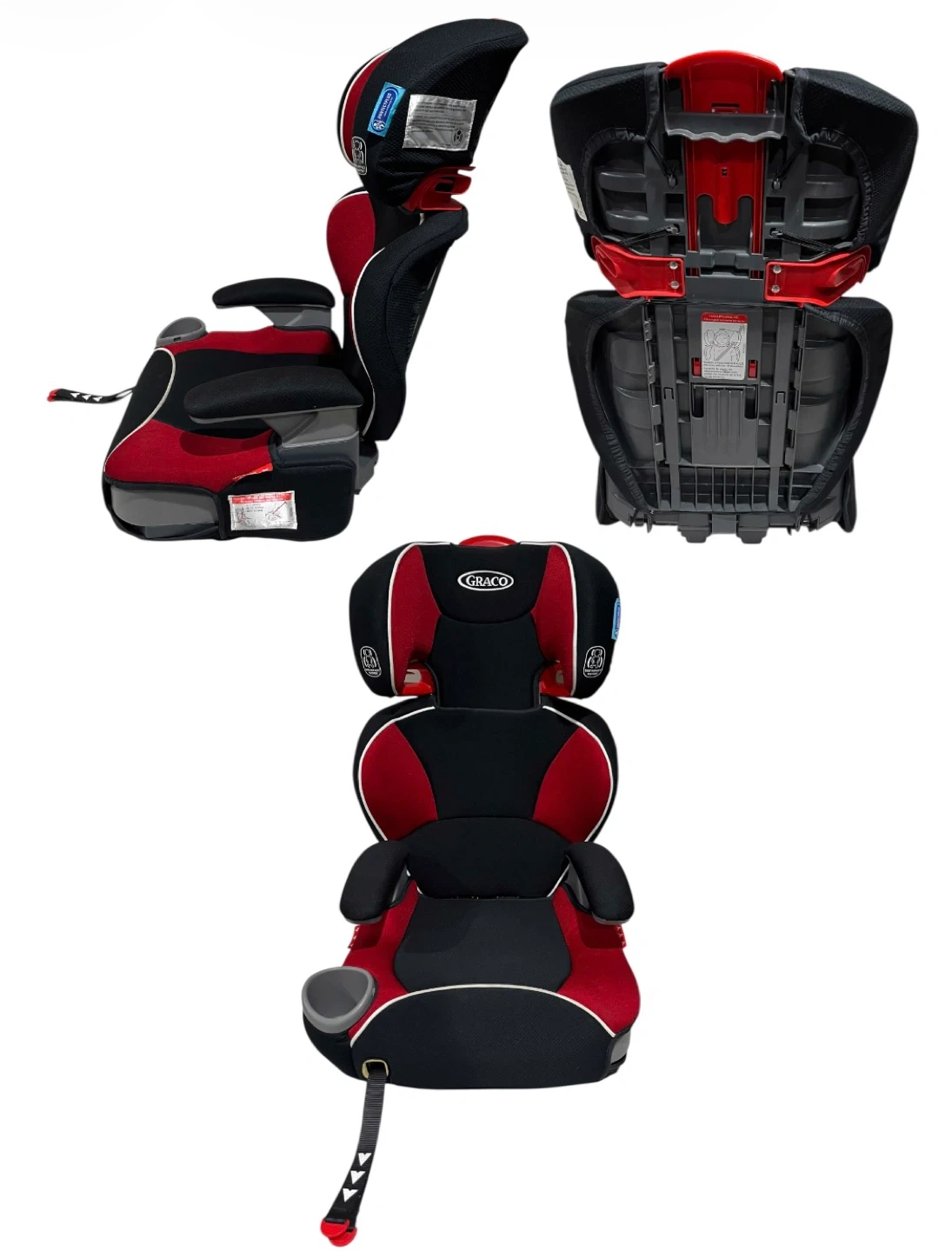 Graco booster car seat in red and black. Features adjustable headrest and cup holders. Seat can be converted to a backless booster. Includes harness strap.