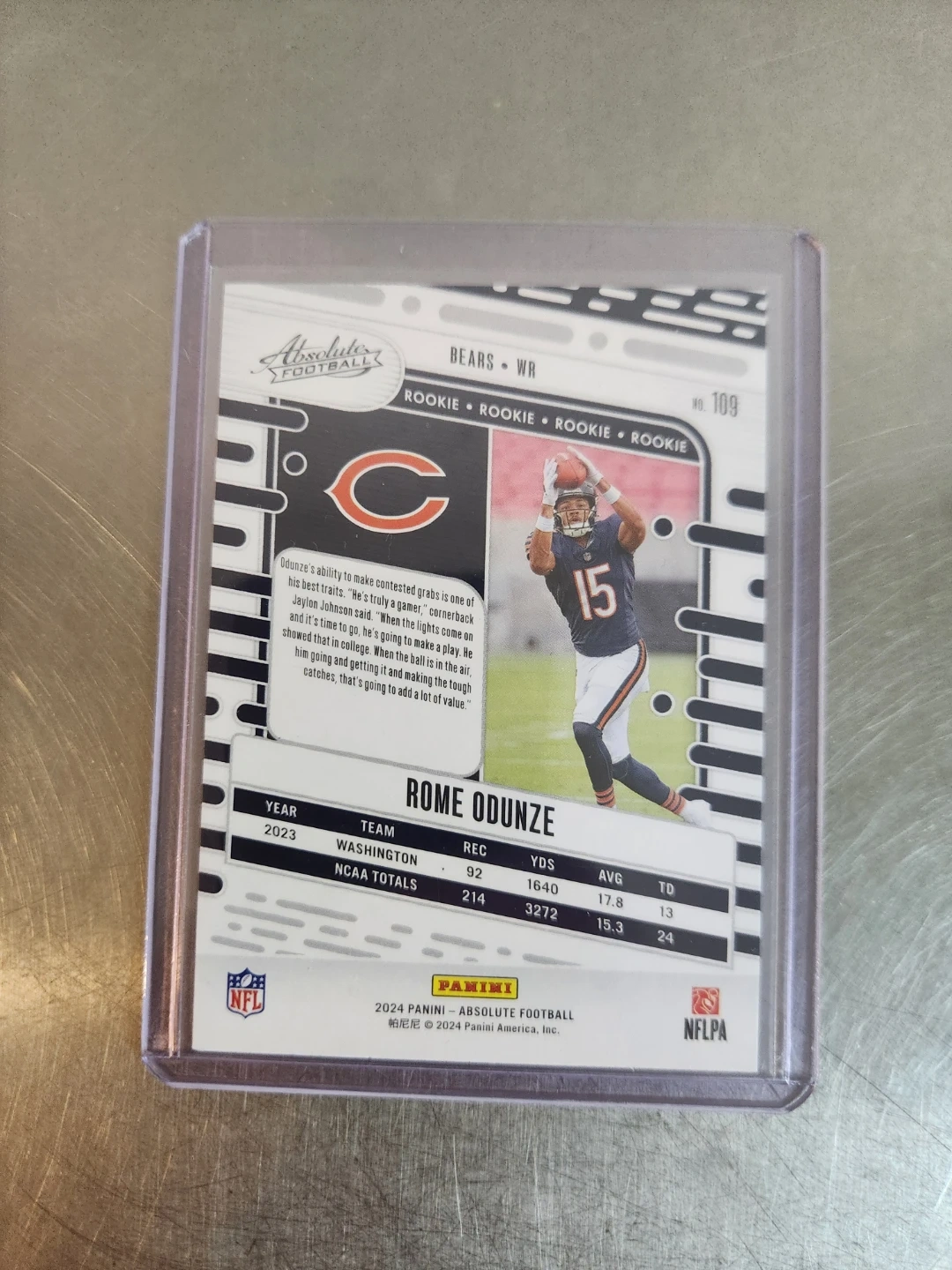 Selling a Rome Odunze Rookie Card from Absolute Football. It features the Chicago Bears wide receiver. A great addition for any sports card collector!