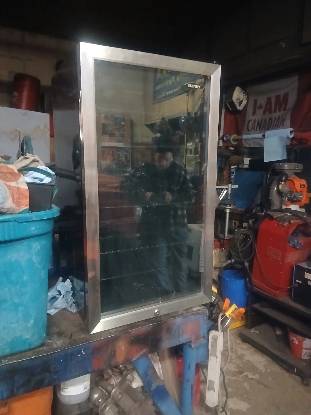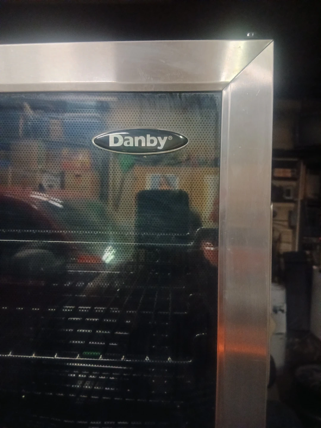 Danby beverage cooler with a stainless steel frame and glass door. It's free-standing and non-encaseable. This unit operates on 115 volts and has a frequency of 60 Hz.