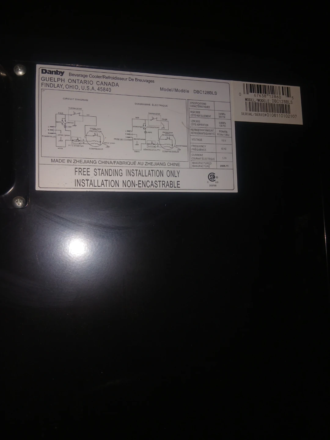 Danby beverage cooler with a stainless steel frame and glass door. It's free-standing and non-encaseable. This unit operates on 115 volts and has a frequency of 60 Hz.